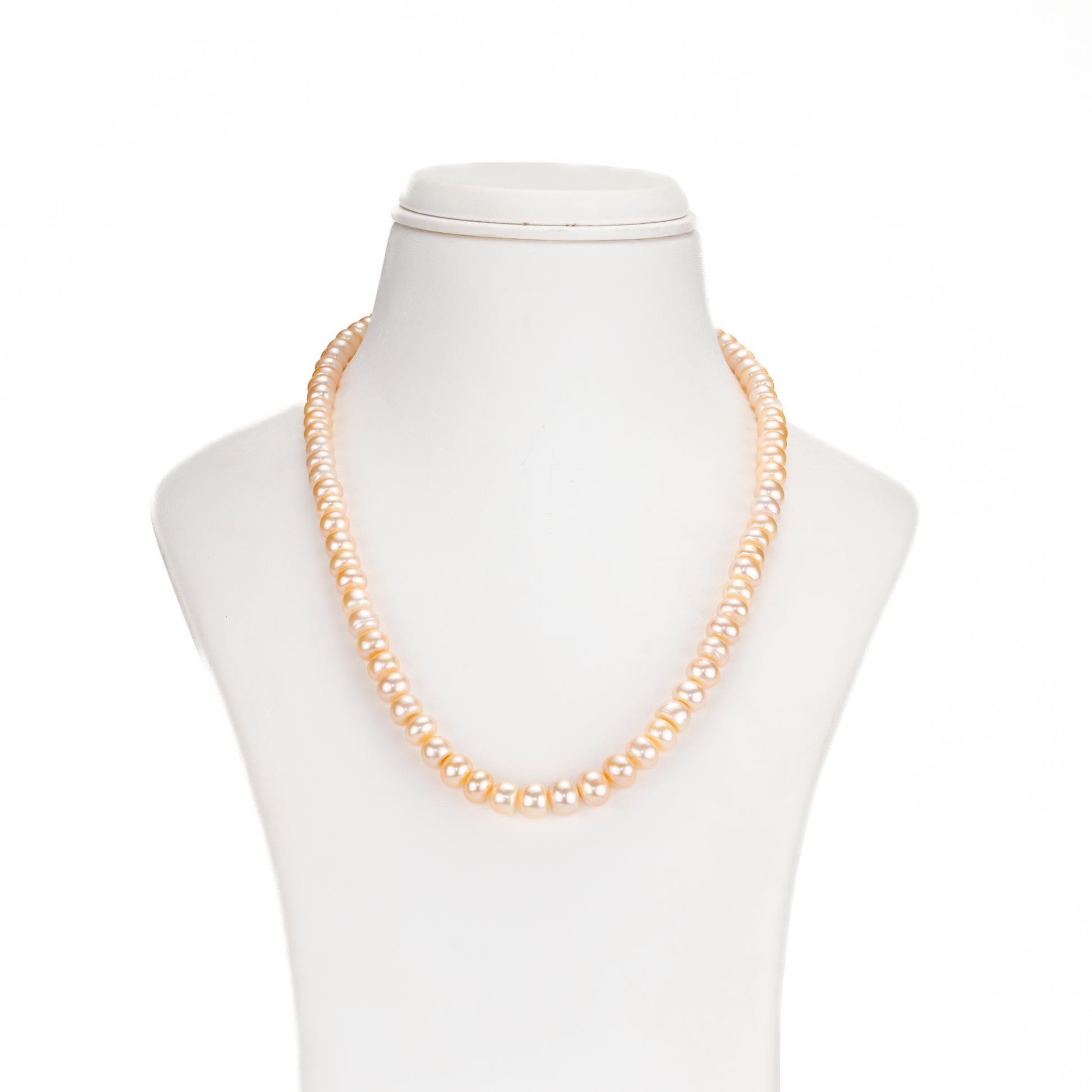 Elevate your elegance with this exquisite 18-inch necklace made of high-quality pink button-shaped freshwater cultured pearls. Featuring a single graceful row and weighing approximately 38.500 grams, each pearl is handpicked and graded 'A' for its radiant luster and refined shape. The necklace is a timeless blend of sophistication and craftsmanship, backed by a lifelong guarantee on pearls—ensuring enduring beauty for years to come. A perfect choice for bridal wear, festive occasions, or formal events, it adds charm to sarees, lehengas, and even chic contemporary outfits with effortless grace.