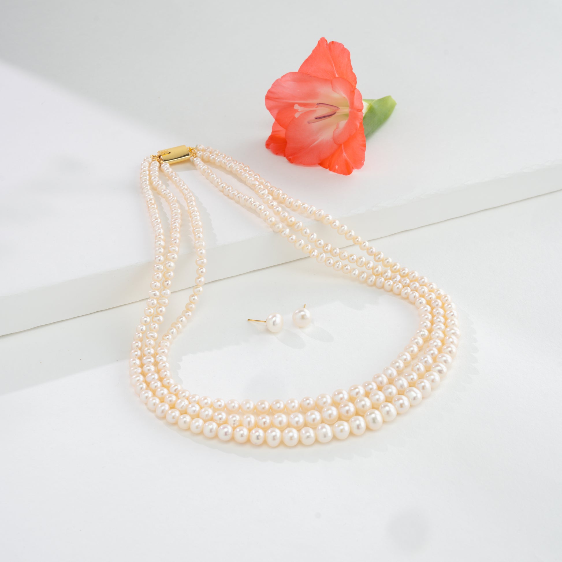 Radiating elegance, this triple-row freshwater cultured pearl necklace is designed with lustrous AA quality near round pearls. The classic white pearls reflect natural beauty and sophistication, while the 18-inch length ensures a graceful drape around the neckline. With an approximate weight of 70 grams, this necklace offers a perfect balance of substance and style, making it a timeless treasure in any collection. Backed by a life-long guarantee on pearls, it promises lasting elegance. Perfect for weddings, festive celebrations, and formal gatherings, it also enhances everyday and professional attire with a refined touch of sophistication and charm.