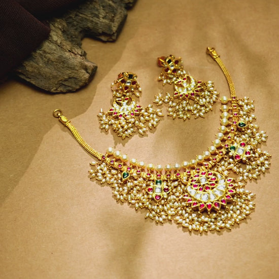 Enquire Now On WhatsAppCelebrate heritage artistry with our Handcrafted Kundan Gutta Pusalu, a timeless jewel that beautifully blends tradition and elegance. Adorned with radiant kundan stones and delicate guttapusalu pearls, this necklace showcases intricate craftsmanship and cultural richness. Each detail is carefully handcrafted to perfection, reflecting devotion, grace, and regal charm. With its antique-inspired design and elegant finish, it stands as a true heirloom piece, symbolizing luxury and tradition in perfect harmony.