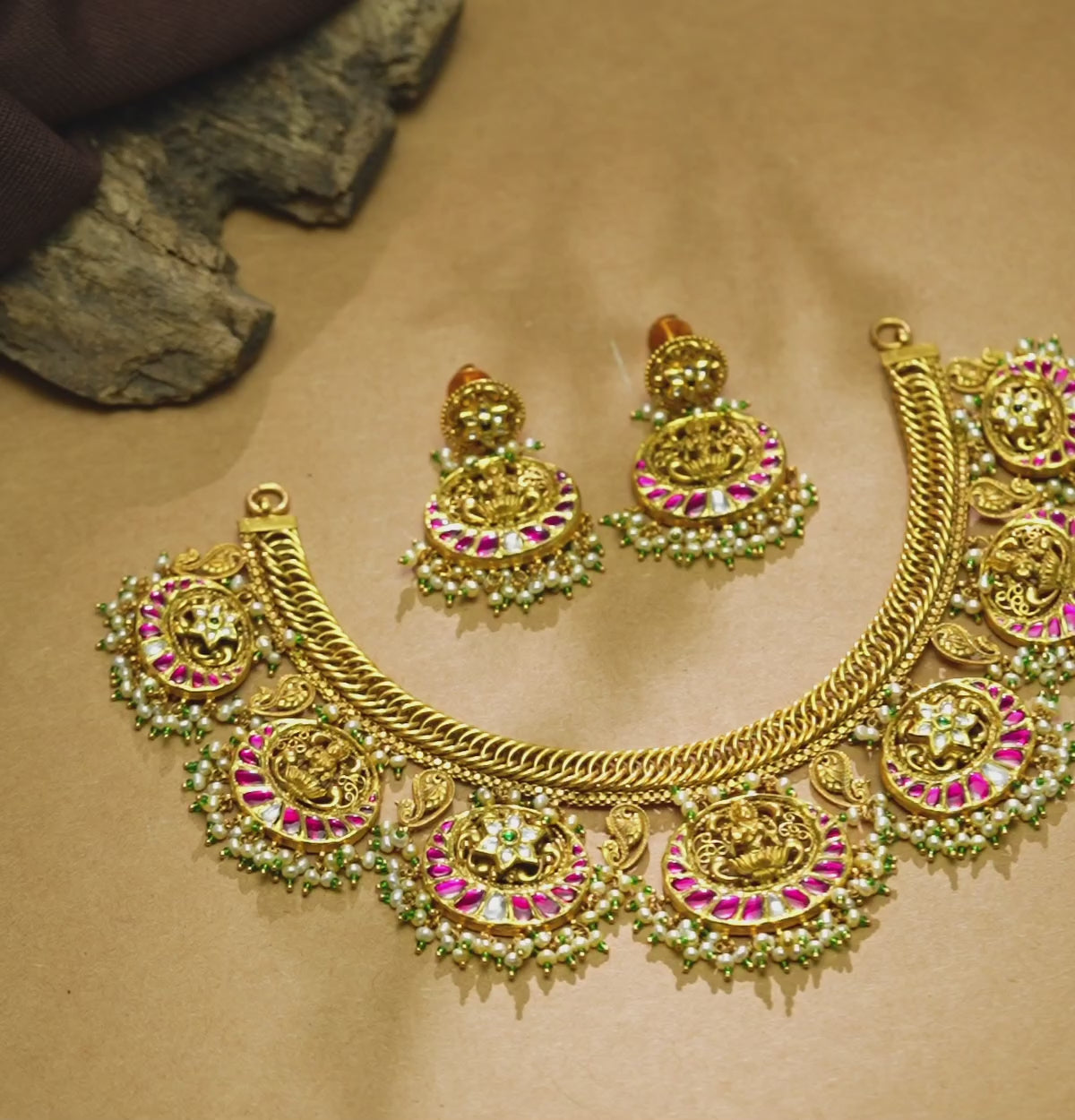 Enquire Now On WhatsAppCelebrate regal tradition with our Heritage Emerald Kundan Gutta Pusalu, an exquisite creation that unites kundan artistry, radiant emeralds, and cascading pearl clusters. The rich green emeralds bring prosperity and elegance, while the intricate kundan detailing reflects masterful craftsmanship. Enhanced with the timeless guttapusalu design, this necklace radiates heritage charm and sophistication. Its graceful finish makes it a true heirloom, embodying both cultural richness and refined luxury. A perfect treasure for women who value tradition and artistry.
