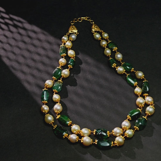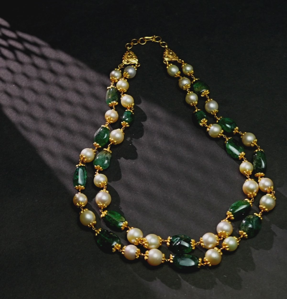 Enquire Now On WhatsAppIntroducing the Intricate Emerald Pearl Taar Mala, a captivating necklace that blends the lush green of emeralds with the lustrous elegance of pearls. Expertly crafted with precision, each bead is thoughtfully arranged to create a balanced, sophisticated design that exudes timeless charm. Lightweight and comfortable, this Taar Mala enhances your neckline with subtle grace while showcasing exquisite craftsmanship. Perfect for weddings, festive occasions, or cultural celebrations, it pairs beautifully with traditional sarees, lehengas, and even contemporary outfits, making it a versatile accessory that elevates your style and adds a touch of refined elegance to any ensemble.