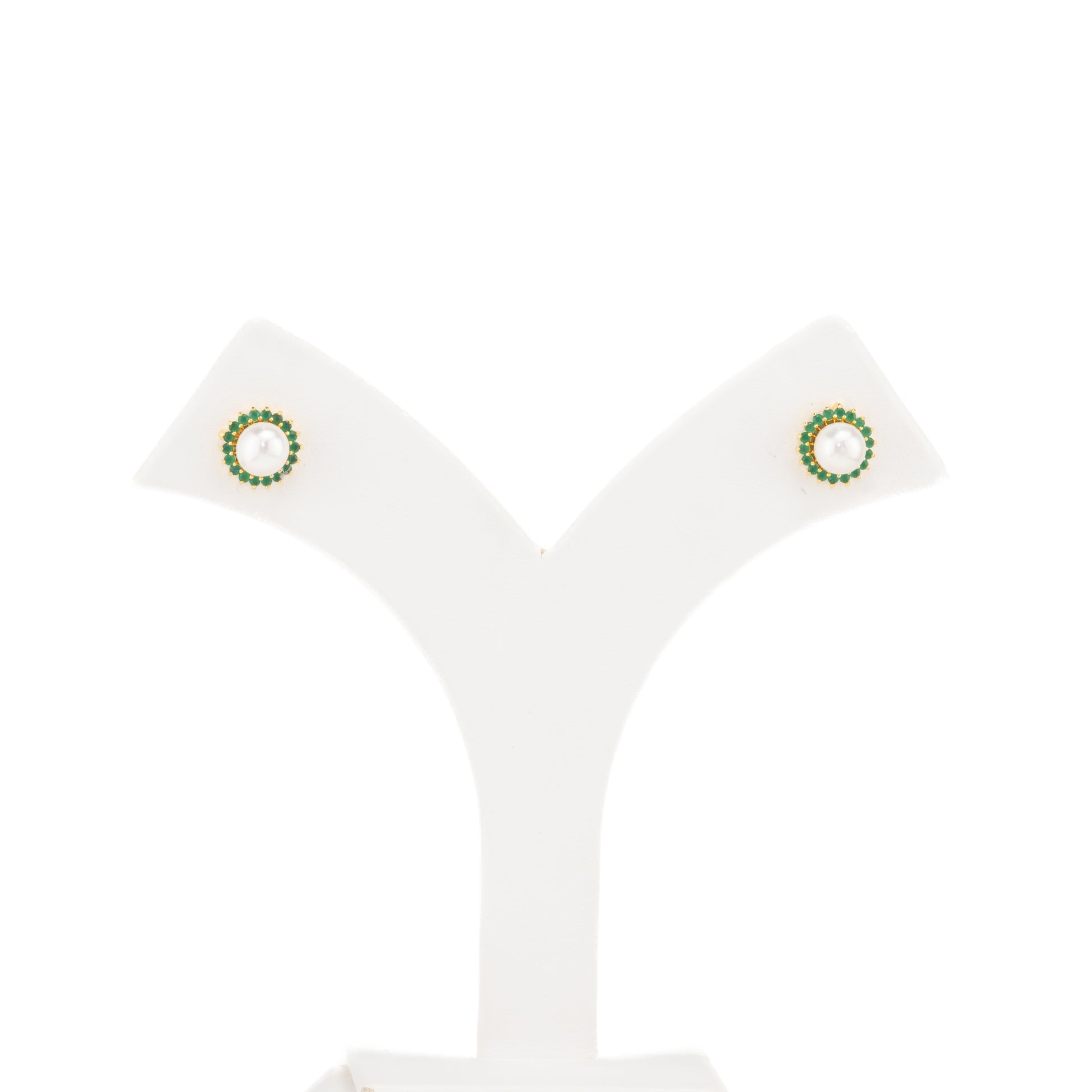 Elevate your style with these Intricate Green Stone Freshwater Pearl Stud Earrings, featuring 7-8MM button-shaped white freshwater cultured pearls of A quality. The luminous pearls paired with vibrant green stones create a graceful contrast, adding sophistication and charm to your look. Backed by our Life Long Guarantee on Pearls, these earrings are perfect for festive occasions, formal gatherings, or as an elegant touch to everyday attire.