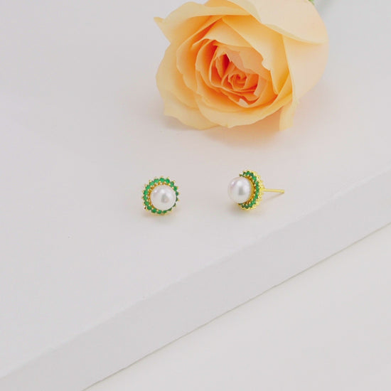 Intricate Green Stone Freshwater Pearl Studs Earrings