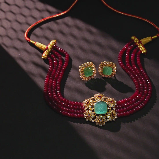 Enquire Now On WhatsAppRadiate timeless elegance with this Intricate Ruby Gold Choker, a masterful fusion of luxurious design and meticulous craftsmanship. Featuring radiant rubies set in exquisite gold work, the choker showcases intricate patterns that reflect sophistication and grandeur. Each detail is carefully crafted to create a harmonious blend of opulence and style, making it a statement piece for any jewelry collection. Comfortable to wear yet striking in presence, it enhances the neckline with regal charm. Perfect for weddings, festive celebrations, or special soirées, this choker complements traditional ethnic wear or modern ensembles, adding a touch of majestic elegance to your attire.
