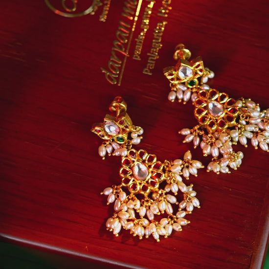 The Intriguing Ruby Gold Pearl Earrings are an elegant fusion of classic design and refined craftsmanship. Crafted in rich gold, they are embellished with radiant rubies and luminous pearls, creating a captivating contrast of color and shine. The intricate detailing enhances their luxurious appeal, while the pearls add a graceful finish to the overall design. Perfectly balancing timeless charm with modern elegance, these earrings make a sophisticated addition to any jewelry collection. Ideal for weddings, festive gatherings, and evening occasions, they complement sarees, lehengas, and fusion outfits, adding a touch of regal beauty and sophistication to your style.