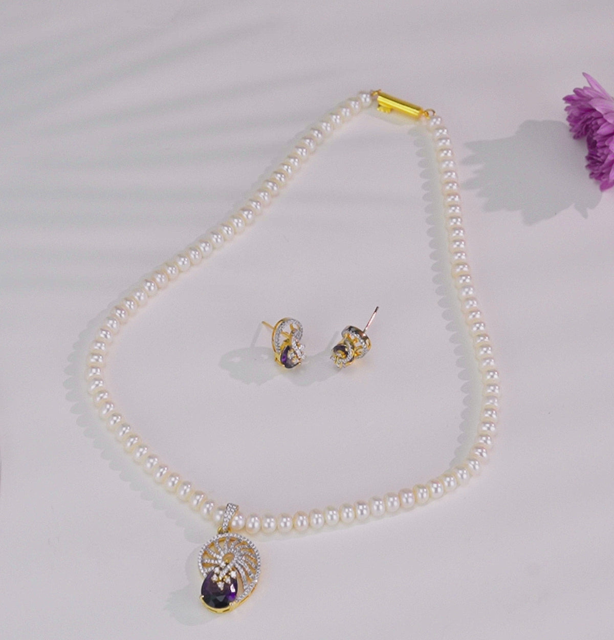 Refined and radiant, the Freshwater Cultured Pearl necklace features a single row of 4–5mm white button pearls in a graceful 16-inch length. Highlighted by a striking blue stone set in a sleek single pendant style, this A quality piece blends simplicity with elegance. Backed by a lifelong guarantee on pearls, it offers timeless appeal and durability. Ideal for office wear, casual outings, or evening dinners, this necklace beautifully complements western dresses, kurtis, and Indo-fusion attire, adding a subtle pop of color and sophistication to your look.