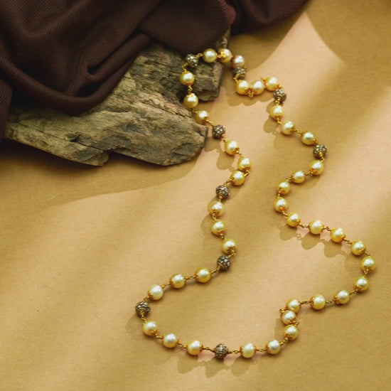 Enquire Now On WhatsAppElevate your style with our Lustrous Pearls Gold Taar Mala, a stunning creation featuring radiant freshwater pearls gracefully woven onto a delicate gold taar. The luminous pearls exude timeless charm, while the fine gold detailing adds richness and sophistication. Crafted with precision, this mala embodies elegance and cultural heritage, making it a treasured piece for any jewelry collection. Its lightweight and versatile design ensures effortless grace for every occasion.