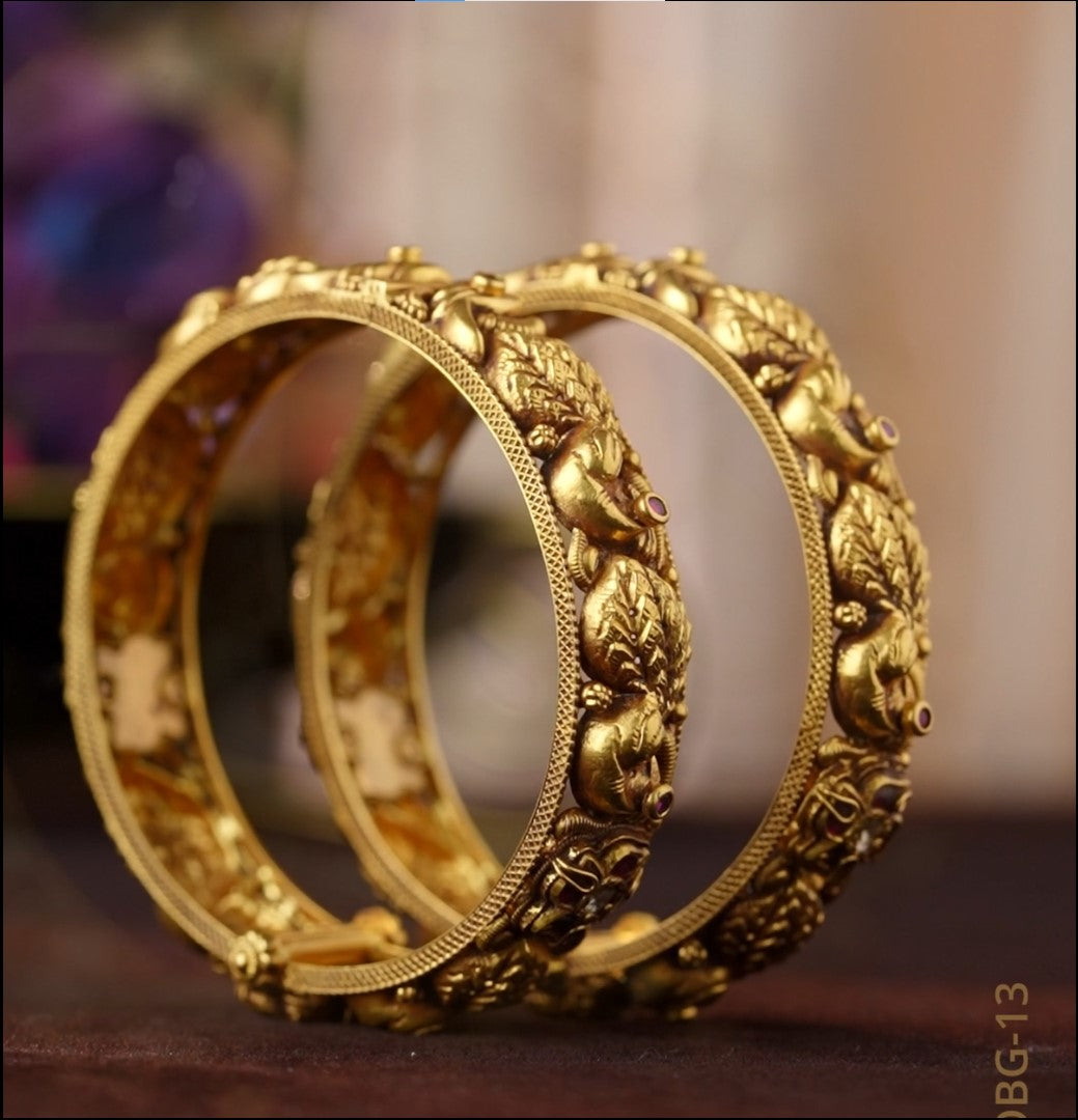 Enquire Now On WhatsAppThe Nakshi Gold Bangle is a masterpiece of traditional artistry, crafted with intricate nakshi work that reflects heritage and fine craftsmanship. Its detailed patterns and radiant golden finish make it a timeless piece of jewelry, symbolizing elegance and cultural richness. Lightweight yet luxurious, this bangle offers comfort along with unmatched sophistication, making it a cherished addition to any collection. With its exquisite design, it blends tradition with refined beauty, perfect for women who admire classic charm. Ideal for weddings, festive occasions, and cultural gatherings, it pairs beautifully with sarees, lehengas, and traditional attire, adding regal grace and timeless elegance.