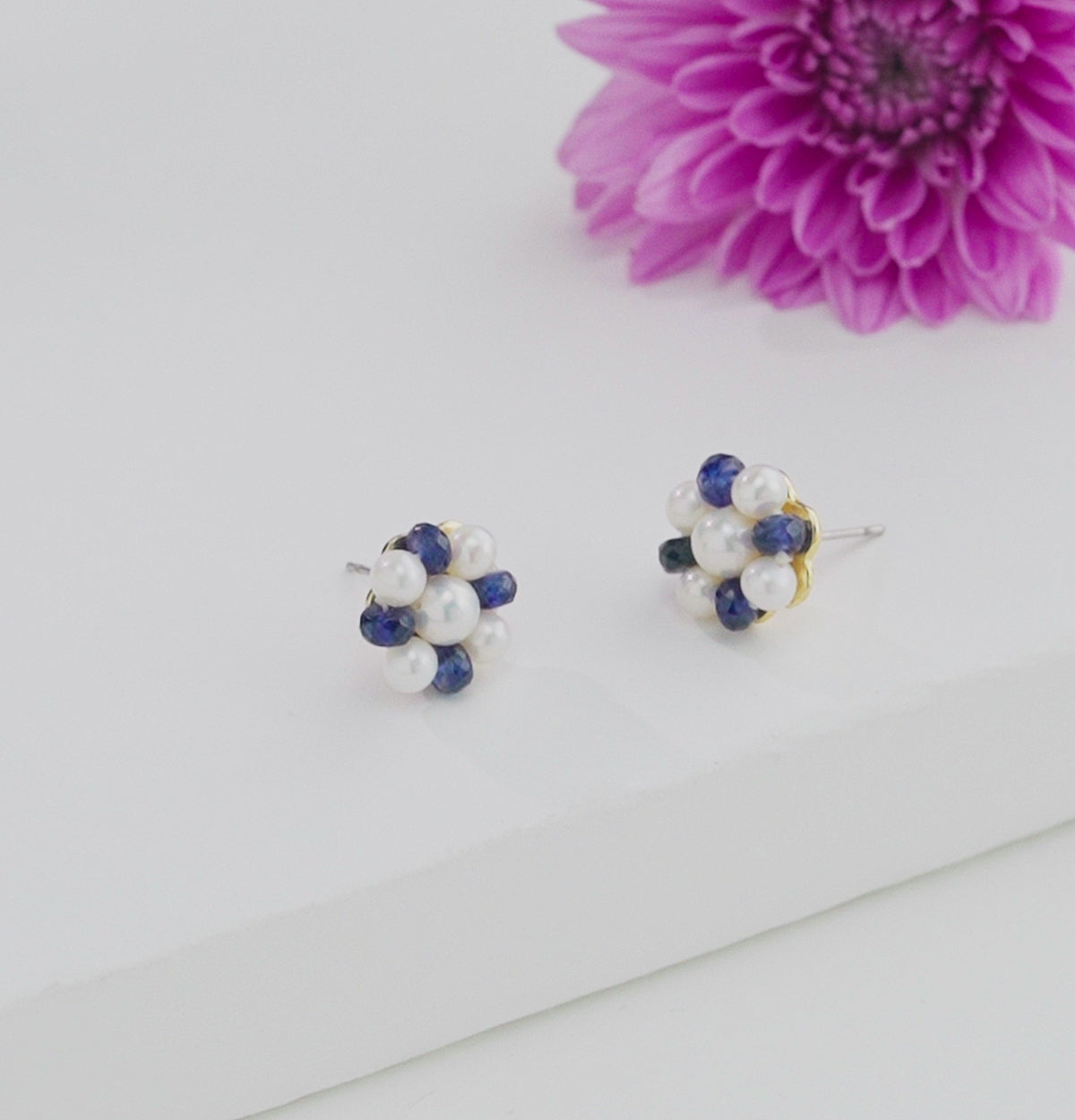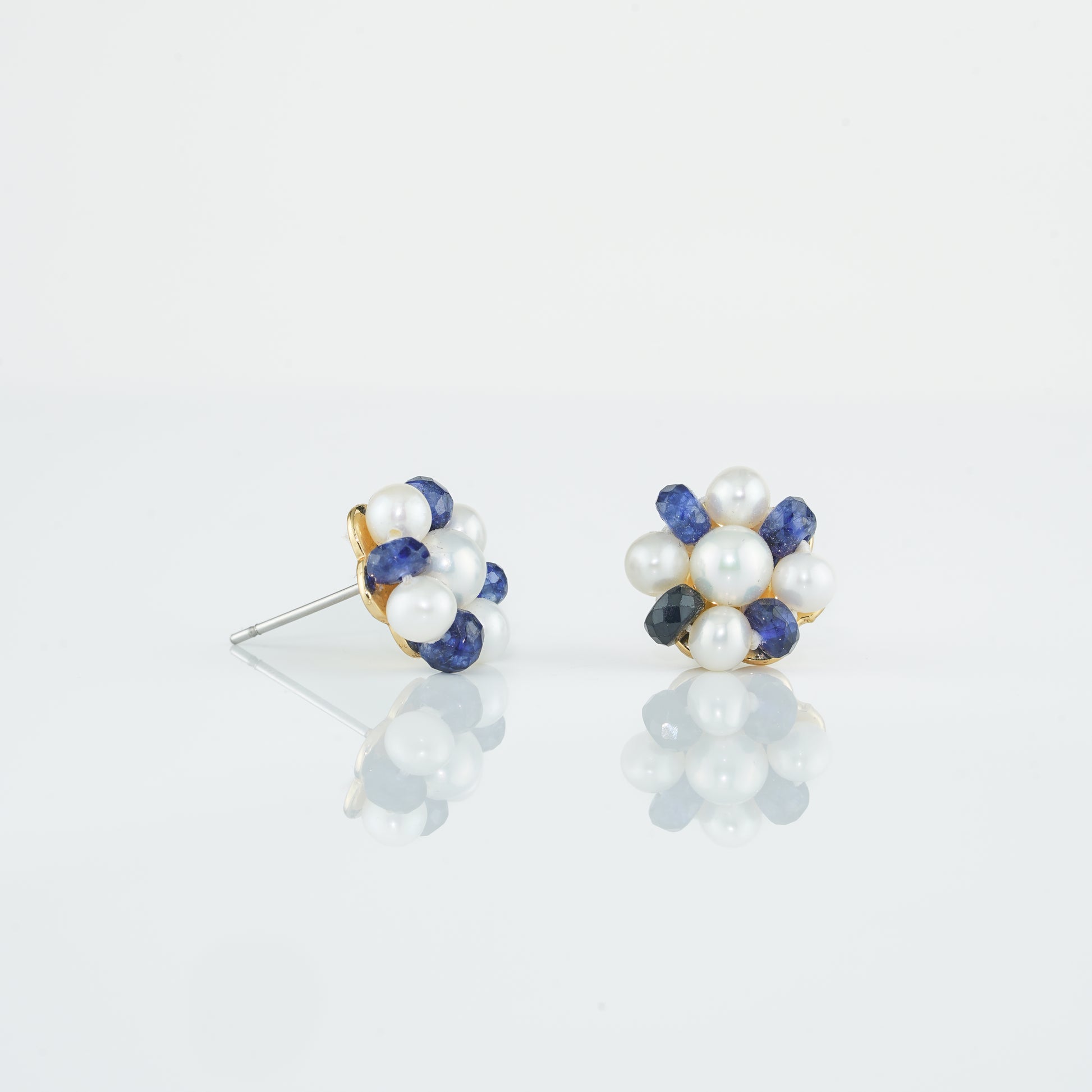 Natural Blue Sapphire Near Round White Freshwater Pearl Stud Earrings