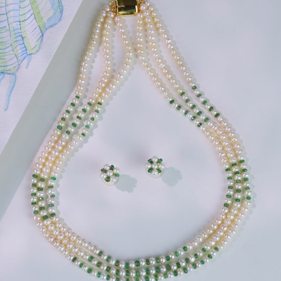 Embrace refined elegance with this 3-row necklace featuring AA-quality freshwater cultured white button pearls, sized 5–6 mm, and adorned with cut-faceted natural emeralds. Weighing approximately 57.4 grams and measuring 18 inches in length, this necklace offers a perfect balance of grace and color. The vivid green of the emeralds enhances the serene beauty of the pearls, all backed by a lifelong guarantee on pearls and natural stones. Ideal for weddings, cultural festivities, and evening gatherings, this piece complements traditional outfits and contemporary fusion wear with timeless sophistication.