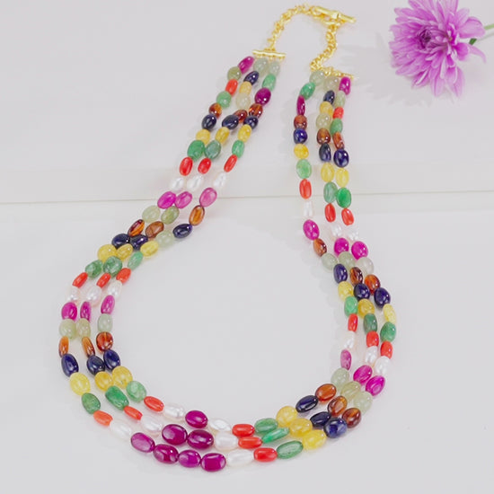 Celebrate tradition and color with our Natural Navratna Necklace , crafted using vibrant multicolor tumble beads representing the nine celestial gemstones. Comprising 3 rows of AA quality stones, this stunning necklace weighs approximately 459.50carats and measures 18 inches in length, making it both spiritually significant and visually captivating.