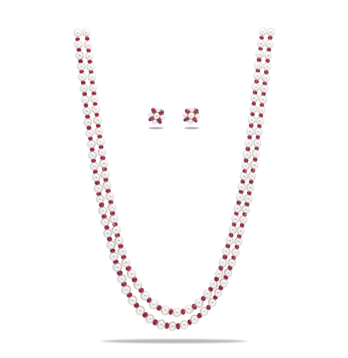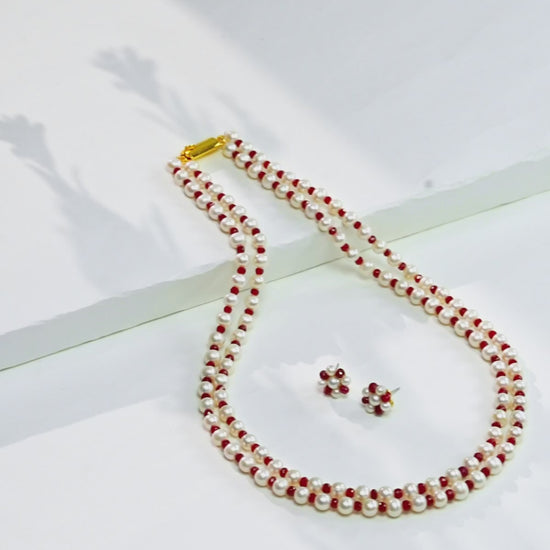 Elevate your elegance with this exquisite 2-row necklace featuring luminous 5-6MM round white freshwater cultured pearls paired with faceted red natural rubies. Weighing 48 grams and stretching 18–19 inches in length, each AA quality pearl is carefully selected for its luster and charm. Accented with radiant cut stones, this necklace offers a perfect balance of sophistication and vibrance. Backed by a lifelong guarantee on pearls and natural stones, it's a timeless piece of craftsmanship. Ideal for weddings, festive gatherings, or formal attire, it complements both traditional and contemporary outfits beautifully.