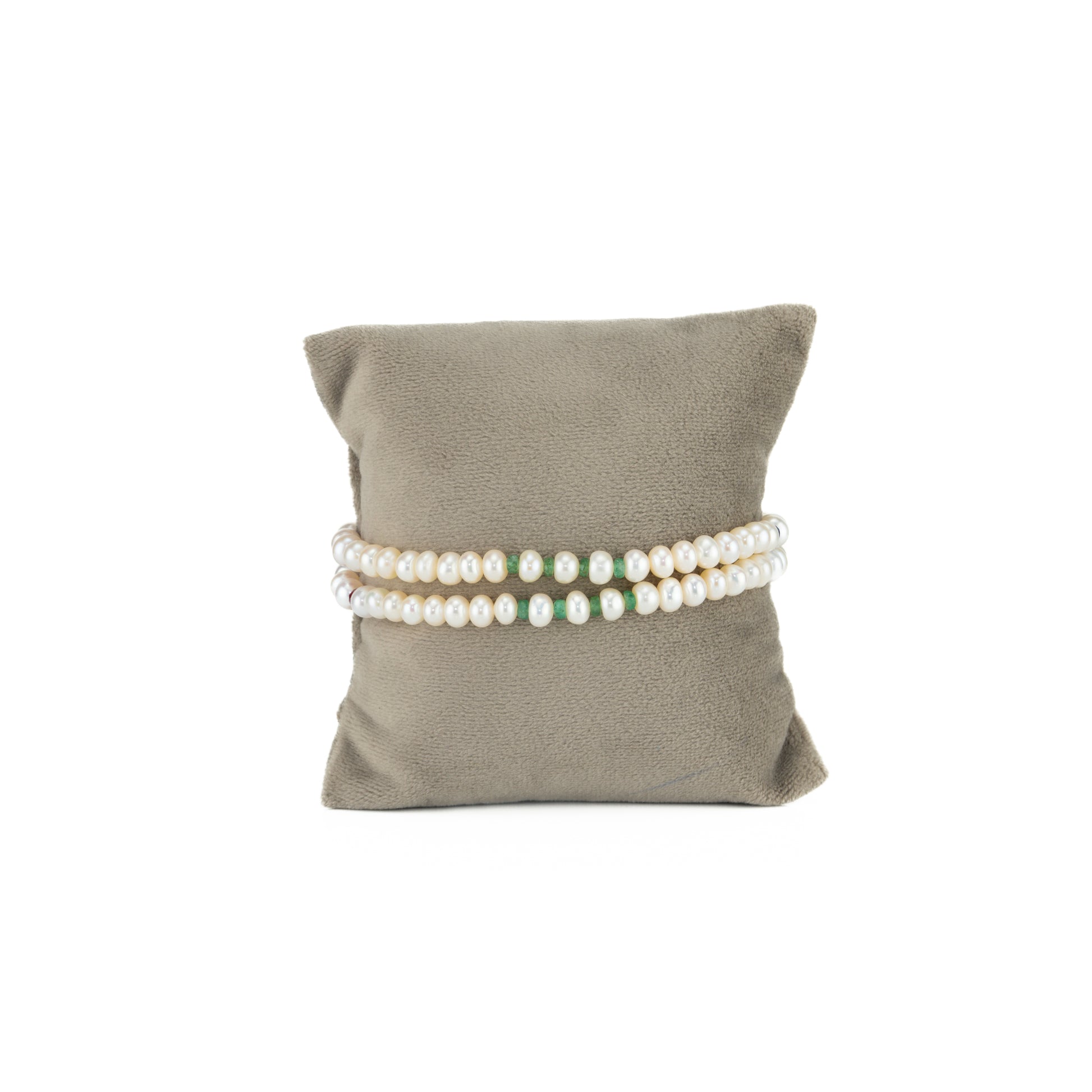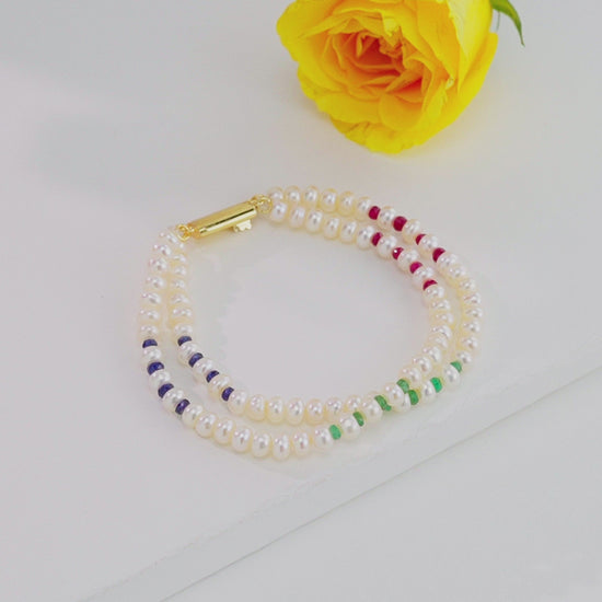 Celebrate the brilliance of color and craftsmanship with this Natural Ruby Emerald Blue Sapphire Pearl Bracelet, a mesmerizing blend of elegance and artistry. Designed with Freshwater Cultured Pearls of 5–6 mm in a smooth button shape, it showcases Natural Rubies, Emeralds, and Blue Sapphires in a harmonious mix of red, green, and blue hues. The two-row design, weighing approximately 15.7 grams and measuring 7 inches, offers a perfect balance of grace and vibrance.