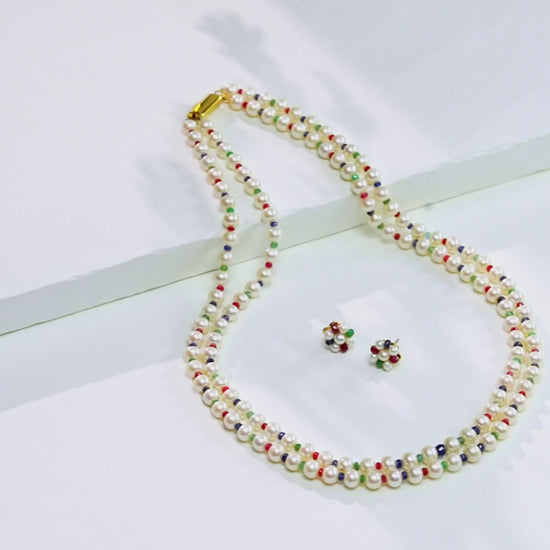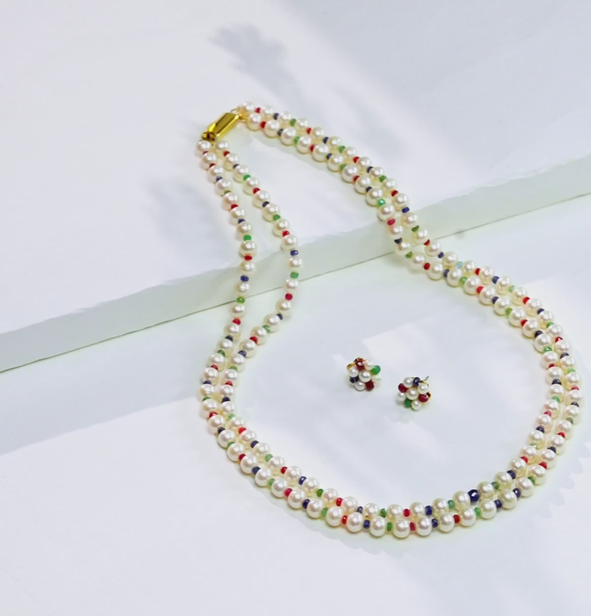 Elevate your elegance with this exquisite 2-row necklace crafted from Freshwater Cultured Pearls & Beads. Featuring luminous 6-7 MM round white pearls of AA quality, it is adorned with cut-faceted Natural Ruby, Emerald, and Sapphire stones in vibrant red, green, and blue. Weighing approximately 49.7 grams and measuring 18 inches in length, this timeless piece comes with a lifelong guarantee on pearls. Perfect for weddings, festive celebrations, or formal occasions, it adds a touch of sophistication to both traditional and contemporary attire.