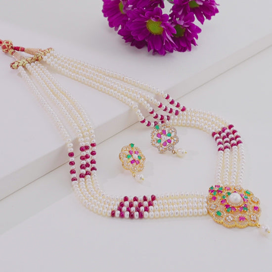 Elevate your elegance with this stunning Natural Ruby and Freshwater Pearl Necklace Set. Featuring three rows of lustrous white button-shaped pearls, each hand-selected for their AA quality and smooth, radiant surface. The U-shaped pendant is beautifully accented with a vibrant red natural ruby, adding a touch of regal charm to your look.