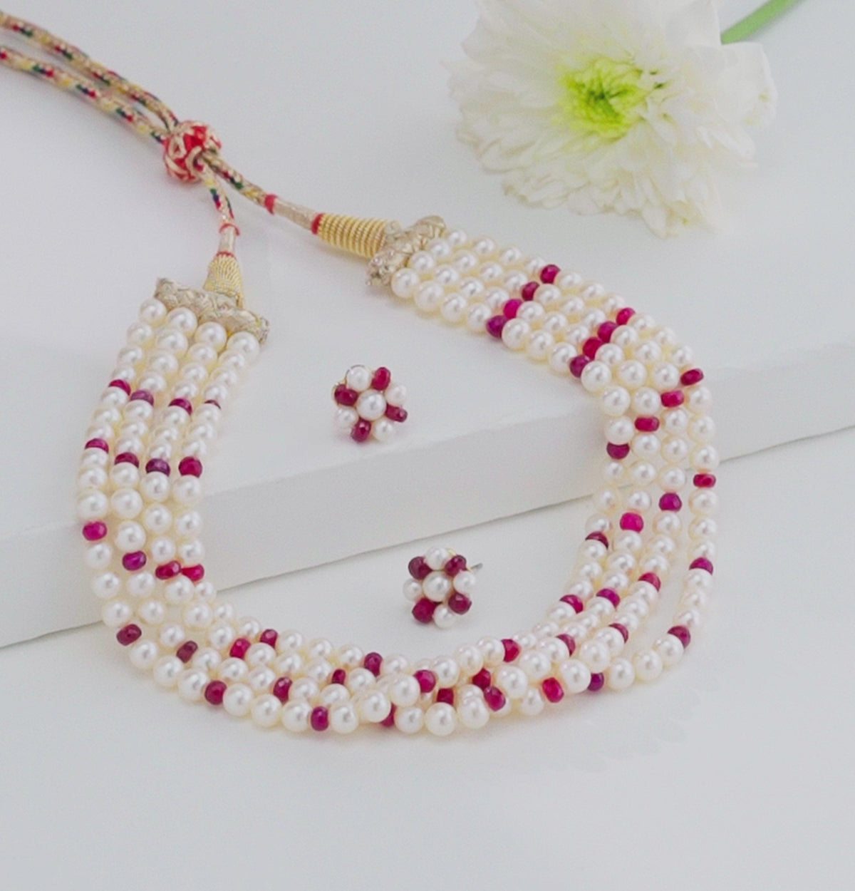This magnificent choker necklace features 5-6MM white near round freshwater cultured pearls of A quality, beautifully arranged in four elegant rows over a 10-inch length. The design is elevated with a vibrant red ruby stone, creating a luxurious blend of sophistication and tradition. Backed by a life-long guarantee on pearls, this choker is a statement piece ideal for weddings, festive occasions, and grand celebrations. Its royal charm perfectly complements traditional attire while adding richness to contemporary ensembles.