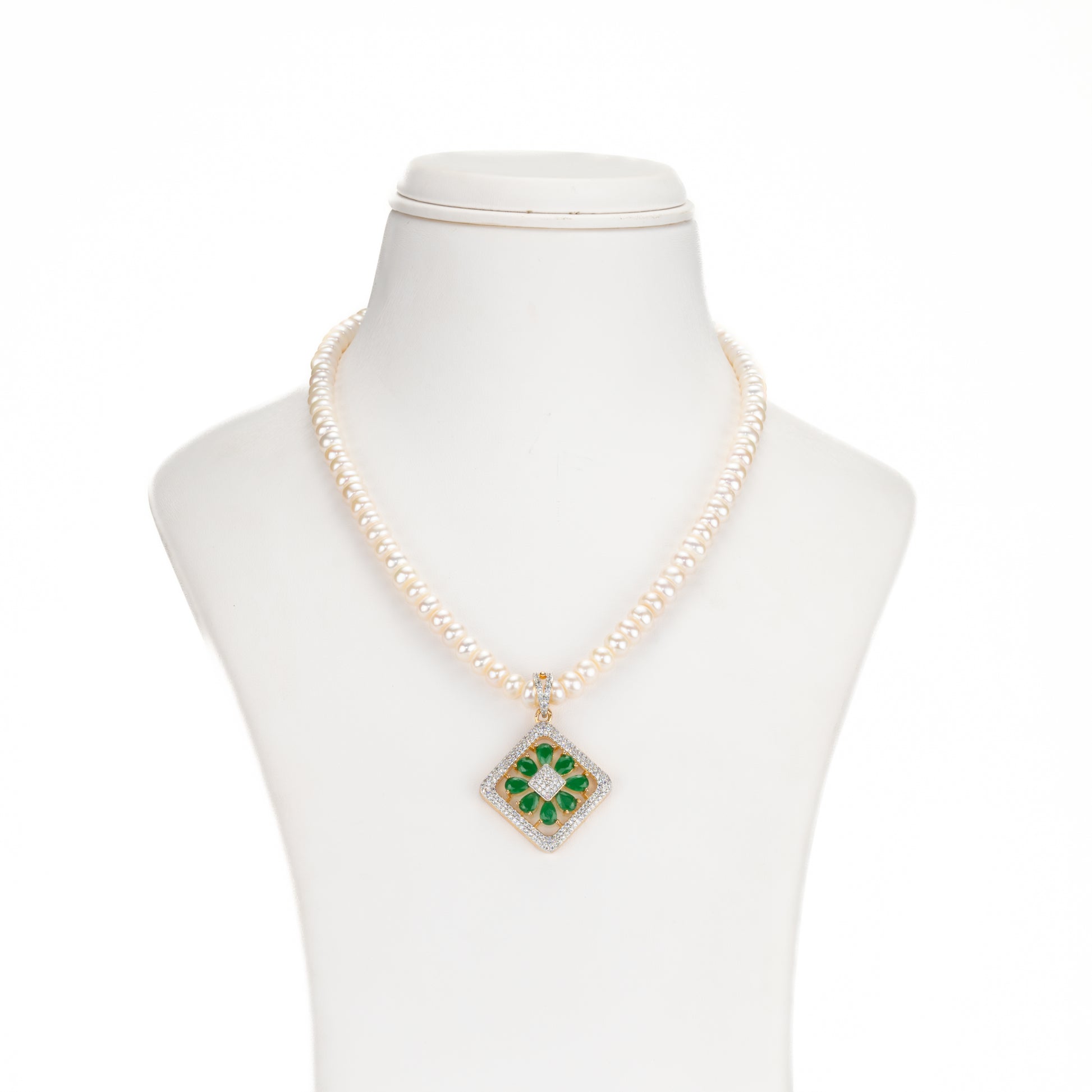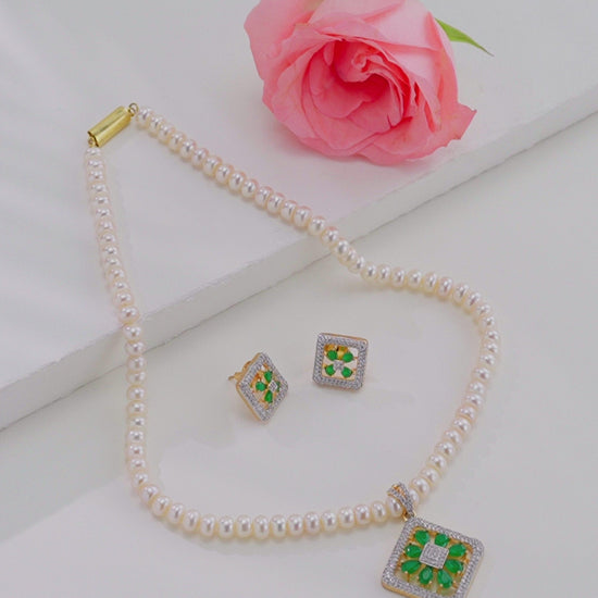 Step into refined elegance with the Ornate Green Stone Freshwater Pearl Necklace Set, a stunning fusion of classic pearls and vibrant gemstone beauty. Handcrafted with lustrous 4–5 mm white button-shaped freshwater cultured pearls, this necklace exudes a soft, graceful glow that enhances your natural charm. The centerpiece — a radiant green stone pendant — adds a royal allure, making it a statement of sophistication and poise.