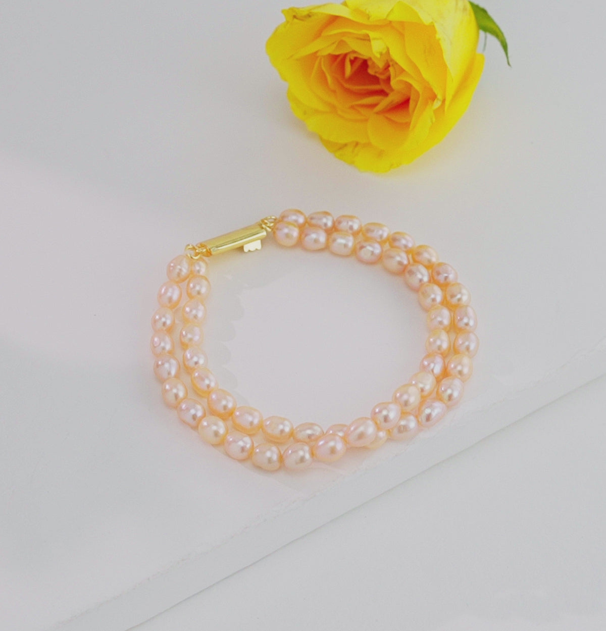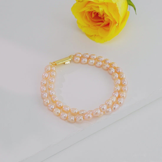 Grace your wrist with the soft elegance of this Pink Drop Pearl Bracelet, meticulously handcrafted using freshwater cultured pearls. Each drop-shaped pearl (5–6 MM) displays a gentle pink hue and natural sheen, reflecting sophistication and charm. The two-row design enhances its graceful appeal, while the bracelet’s 15.9-gram weight and 7-inch length ensure a comfortable, refined fit.