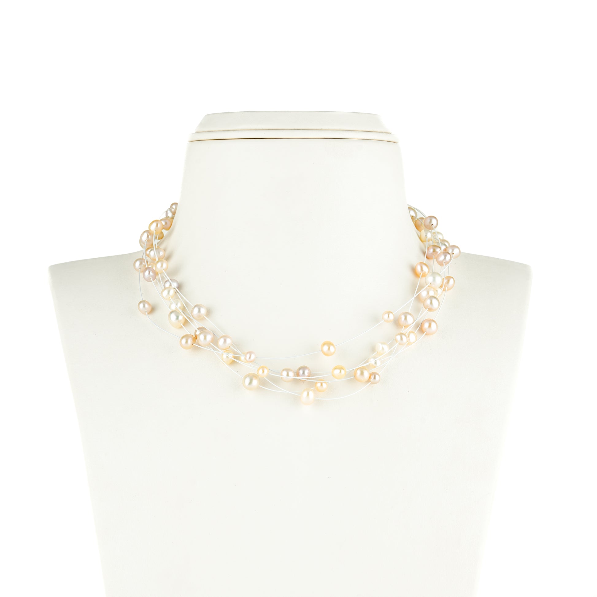 Celebrate grace and femininity with this exquisite choker set, adorned with soft pink freshwater cultured pearls in an elegant near-round shape (6-7 mm, A-grade quality). The six-row design creates a rich, layered look, enhanced by the contemporary charm of a wire mala style. At 16 inches, this statement piece sits beautifully at the neckline, making it perfect for weddings, festive occasions, and evening gatherings. Backed by a life-long guarantee on pearls, it offers timeless beauty you can treasure forever.