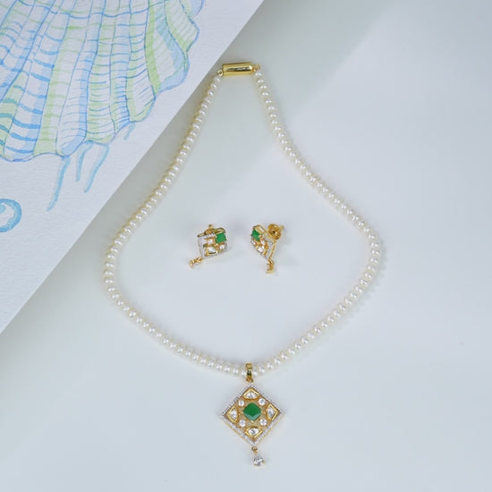 Crafted with luminous 3-4mm white button freshwater cultured pearls, this single-row necklace radiates timeless grace. The 16-inch strand is adorned with a striking green stone pendant, creating a perfect balance of subtlety and elegance. With A-quality pearls and a life-long guarantee, this necklace ensures lasting beauty and value. Ideal for both daily wear and special occasions, it pairs seamlessly with ethnic attire, party outfits, or elegant evening ensembles.