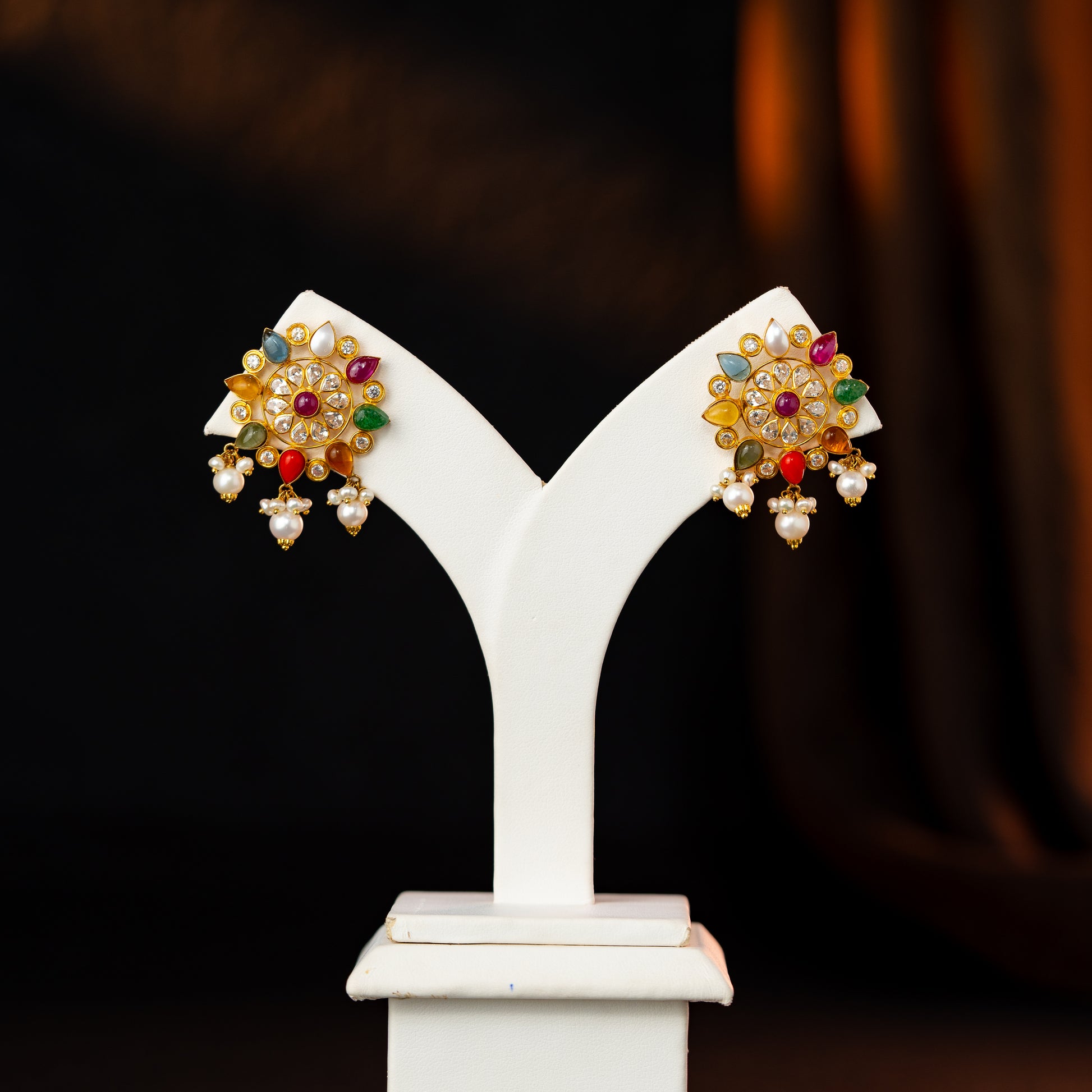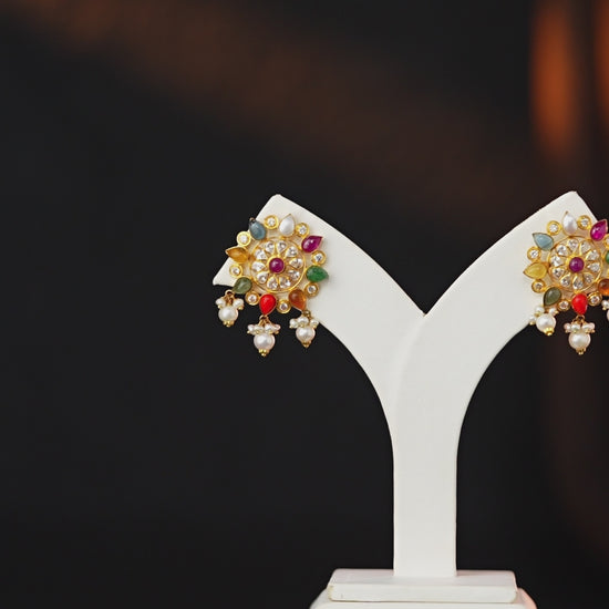 Enquire Now On WhatsAppRadiate royalty and tradition with the Regal Multicolor Navratan Stone Earrings, a stunning fusion of color, culture, and craftsmanship. Adorned with nine sacred gemstones — Ruby, Emerald, Sapphire, Coral, Pearl, Cat’s Eye, Garnet, Topaz, and Stone — these earrings symbolize prosperity, balance, and positive energy. Each stone is intricately set in a rich gold-toned design, creating a mesmerizing multicolor brilliance. Perfect for festive celebrations, weddings, and grand occasions, these earrings capture the essence of regal Indian elegance and timeless artistry.