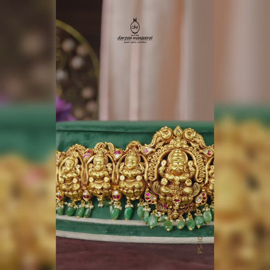 Enquire Now On WhatsAppRadiate divine elegance with this Resplendent Laxmi Devi Vaddanam, crafted with intricate artistry and adorned with the sacred Laxmi Devi motif. Symbolizing prosperity, grace, and blessings, this masterpiece is designed in fine gold with exquisite detailing, making it a true heirloom treasure. The blend of traditional craftsmanship and timeless charm ensures it stands out as a statement jewel for generations. Ideal for weddings, religious ceremonies, and festive occasions, this vaddanam beautifully complements bridal wear, silk sarees, and ethnic ensembles, enhancing your look with regal sophistication and spiritual grace.
