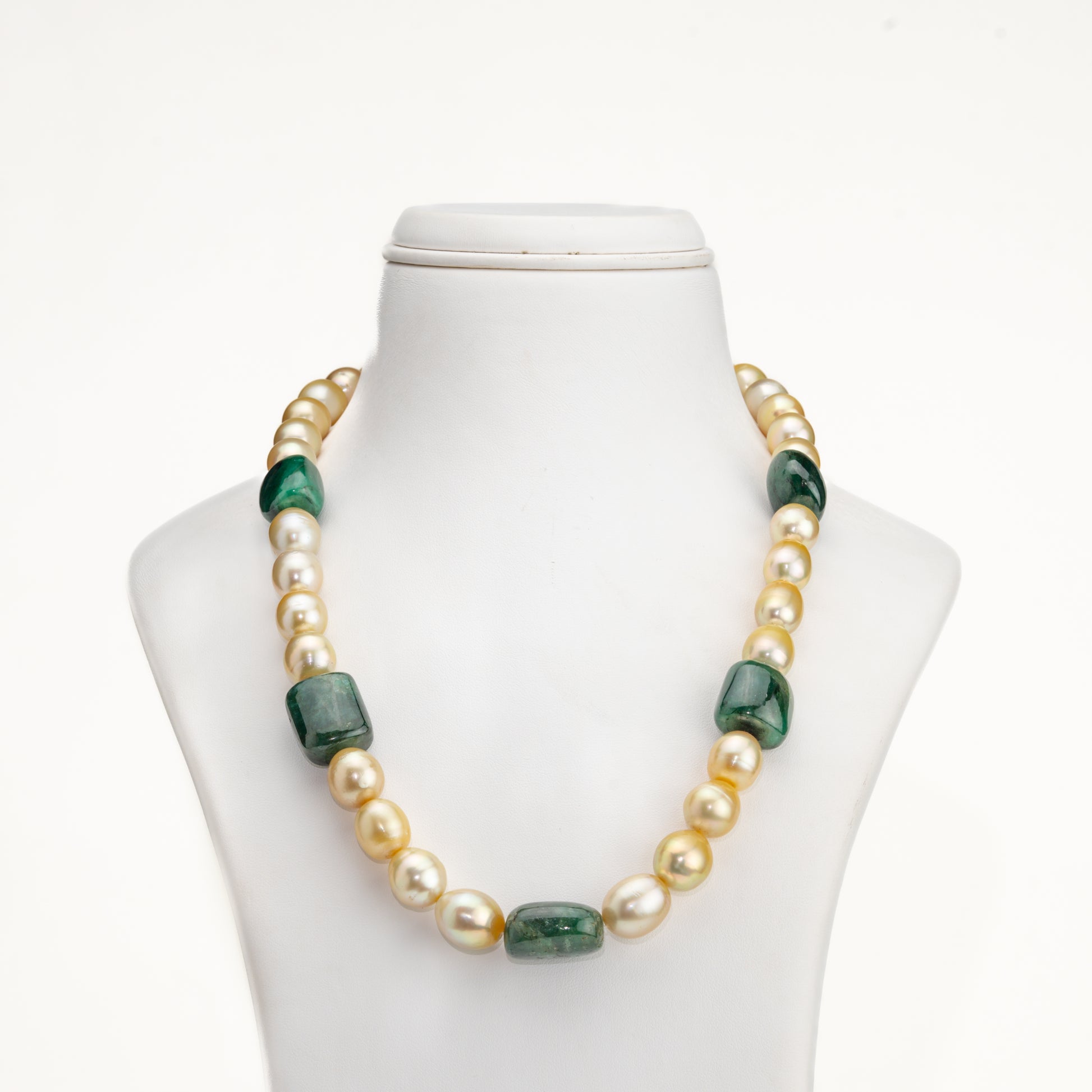 This luxurious necklace set showcases a stunning fusion of natural emerald beads and radiant 12–13mm golden drop-shaped South Sea pearls. Crafted with AA-quality saltwater cultured pearls, it offers exceptional luster, purity, and visual richness. The elegant single-row, 18-inch design features pearls weighing approximately 535.15 carats, highlighting refined craftsmanship and premium materials. Backed by a Life Long Guarantee on Pearls and a Certificate of Authenticity, every element is guaranteed genuine and of superior quality.