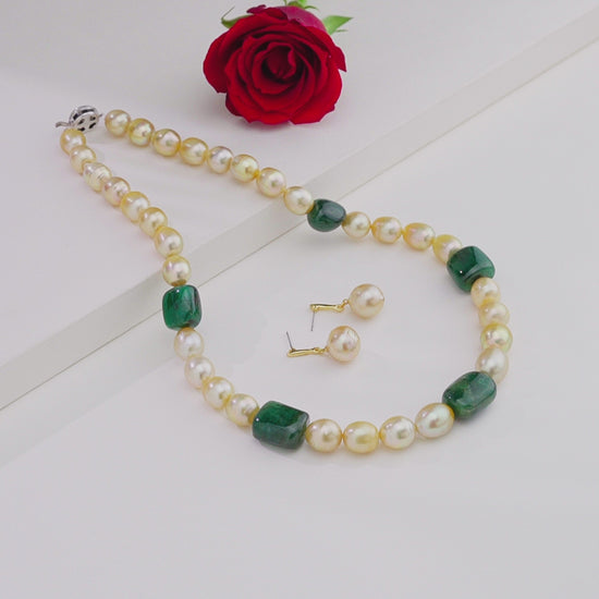Natural Emerald Beads & 12.0–13.0mm Golden Drop South Sea Pearl Necklace Set – AA Quality (RM23)