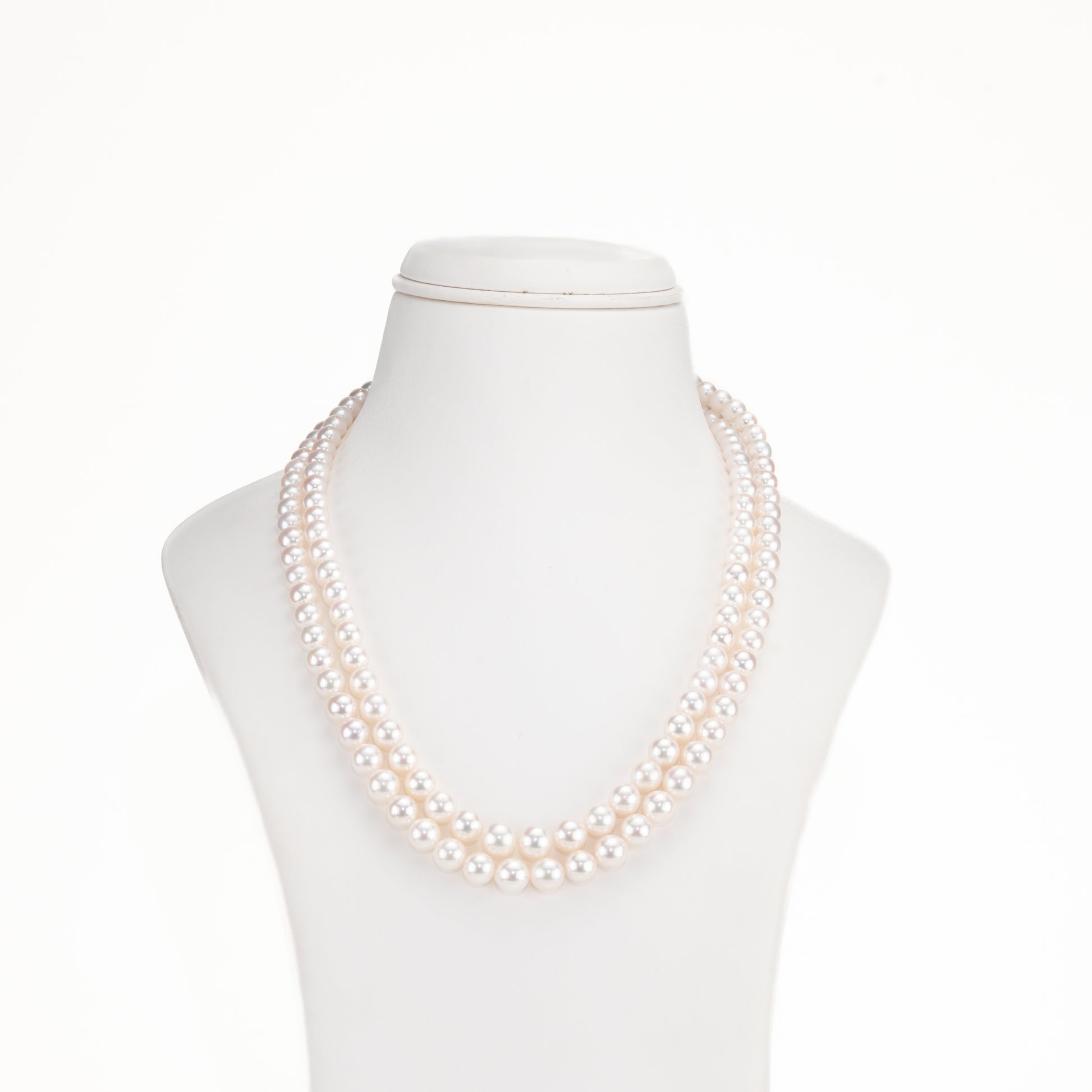 Elevate your elegance with this luxurious White Akoya Pearl Necklace Set, featuring exquisite saltwater cultured pearls of AAA quality. Each round pearl displays radiant luster, exceptional smoothness, and a refined white sheen. Designed with two elegant rows and an 18-inch length, this necklace weighs approximately 342.4 carats, offering a stunningly graceful drape. Accompanied by a Certificate of Authenticity, it assures that every pearl is 100% genuine and meticulously crafted. Ideal for weddings, grand celebrations, or formal occasions, this timeless piece enhances both ethnic and contemporary ensembles with an aura of sophistication and grace.