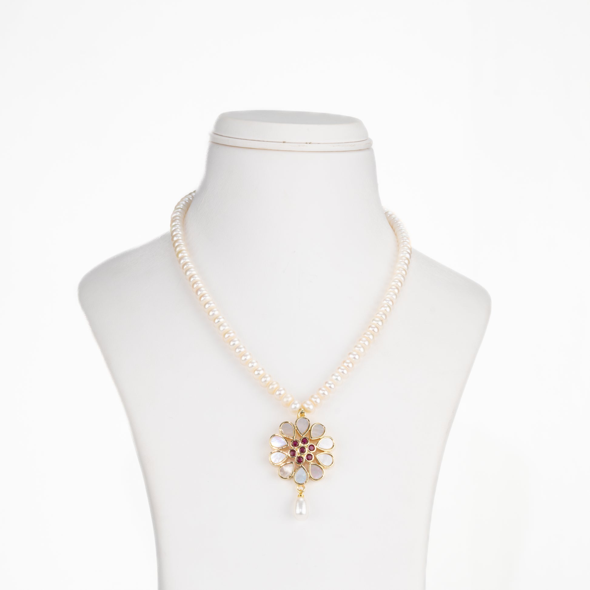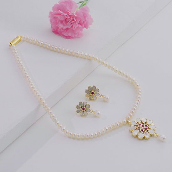 This Shiny Red Stone Freshwater Pearl Necklace Set (Product Code AD34) is a beautifully classic piece combining the luster of natural pearls with a vibrant splash of color.