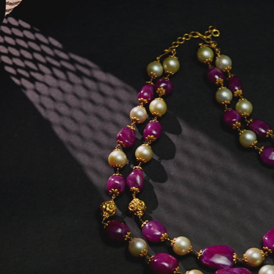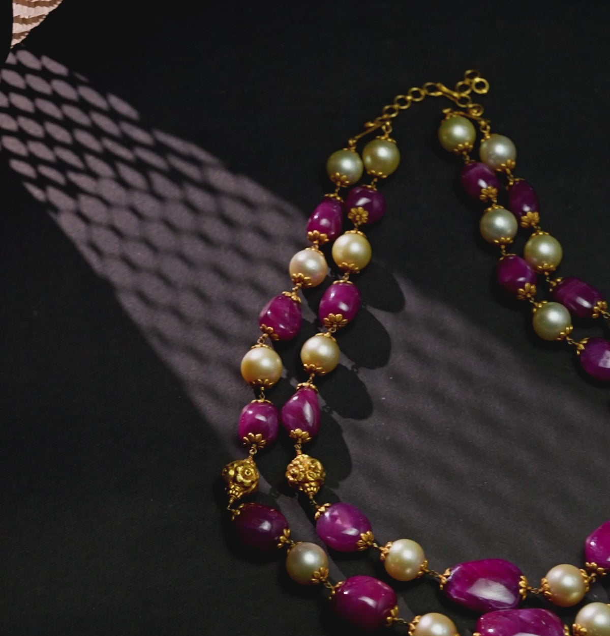 Enquire Now On WhatsAppIntroducing the Sleek Ruby Pearl Taar Mala, a perfect blend of sophistication and timeless elegance. Expertly crafted with lustrous pearls and vibrant rubies, this necklace exudes a refined charm that enhances any ensemble. Its sleek design ensures a comfortable fit while making a subtle yet striking statement. The harmonious arrangement of ruby and pearl beads adds a touch of luxury and grace, reflecting impeccable craftsmanship. Ideal for weddings, festive celebrations, or special gatherings, this Taar Mala pairs beautifully with traditional sarees, lehengas, and contemporary outfits alike, making it a versatile accessory that elevates your style for any occasion.