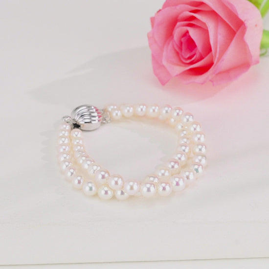 This elegant 6.0–7.0 mm Round White Akoya Saltwater Pearl Bracelet features AA-quality pearls admired for their soft luster, smooth surface, and classic round shape. Designed with a refined double-row arrangement, the bracelet offers a fuller, more luxurious look while maintaining timeless elegance. The luminous white Akoya pearls add sophistication, making this piece ideal for both formal occasions and everyday wear. Measuring 7 inches in length, it provides a comfortable and graceful fit on the wrist. With an approximate pearl weight of 74 carats, it feels substantial yet refined. Backed by a lifetime guarantee on pearls, this bracelet reflects enduring beauty, craftsmanship, and lasting value.
