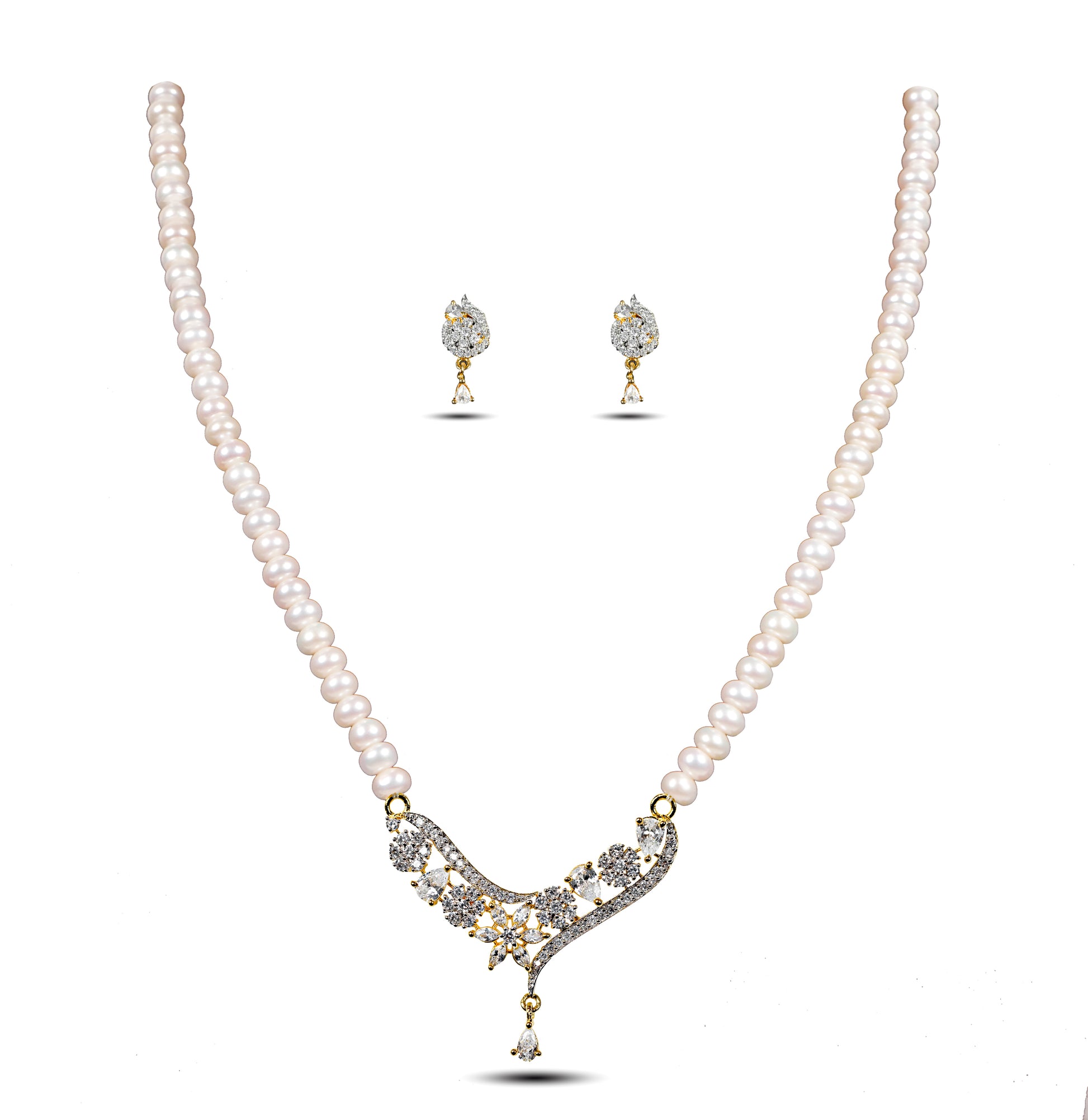 Showcase refined elegance with this 16-inch necklace featuring a delicate U-shape pendant design. Made with lustrous 4–5mm A-grade freshwater cultured pearls in a smooth button shape, its radiant white pearls are paired with a graceful white stone for added charm. Crafted to last a lifetime, this piece comes with a lifelong guarantee on pearls. A perfect mix of classic style and contemporary design, this necklace enhances both traditional and Western outfits—ideal for formal events, parties, or everyday sophistication.