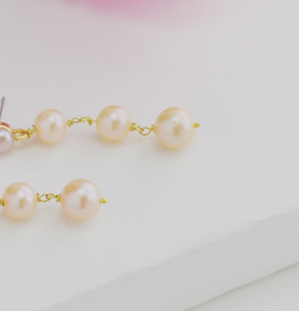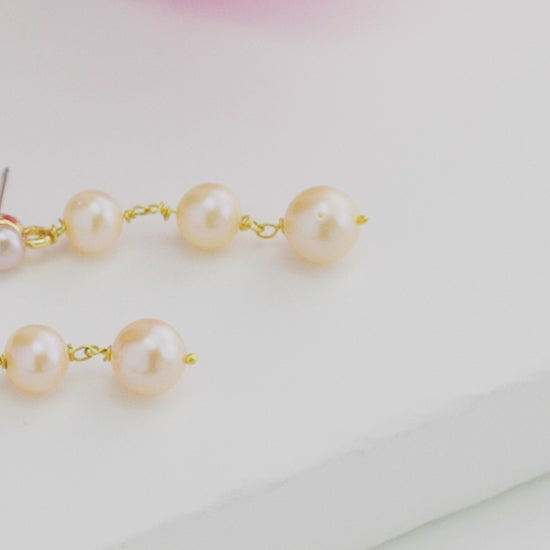 These elegant earrings feature AA-quality Freshwater Cultured Pearls in a refined mix of shapes, presented in a delicate pink hue. Each pearl is carefully graded for its luminous lustre, smooth surface, and consistent quality. Expert craftsmanship ensures both beauty and durability, while our Life Long Guarantee on Pearls offers lasting value. Designed to sway gracefully, these hanging earrings bring a touch of sophistication to any look. Perfect for weddings, festive occasions, or evening gatherings, they pair effortlessly with ethnic wear and also add a graceful accent to chic contemporary ensembles.