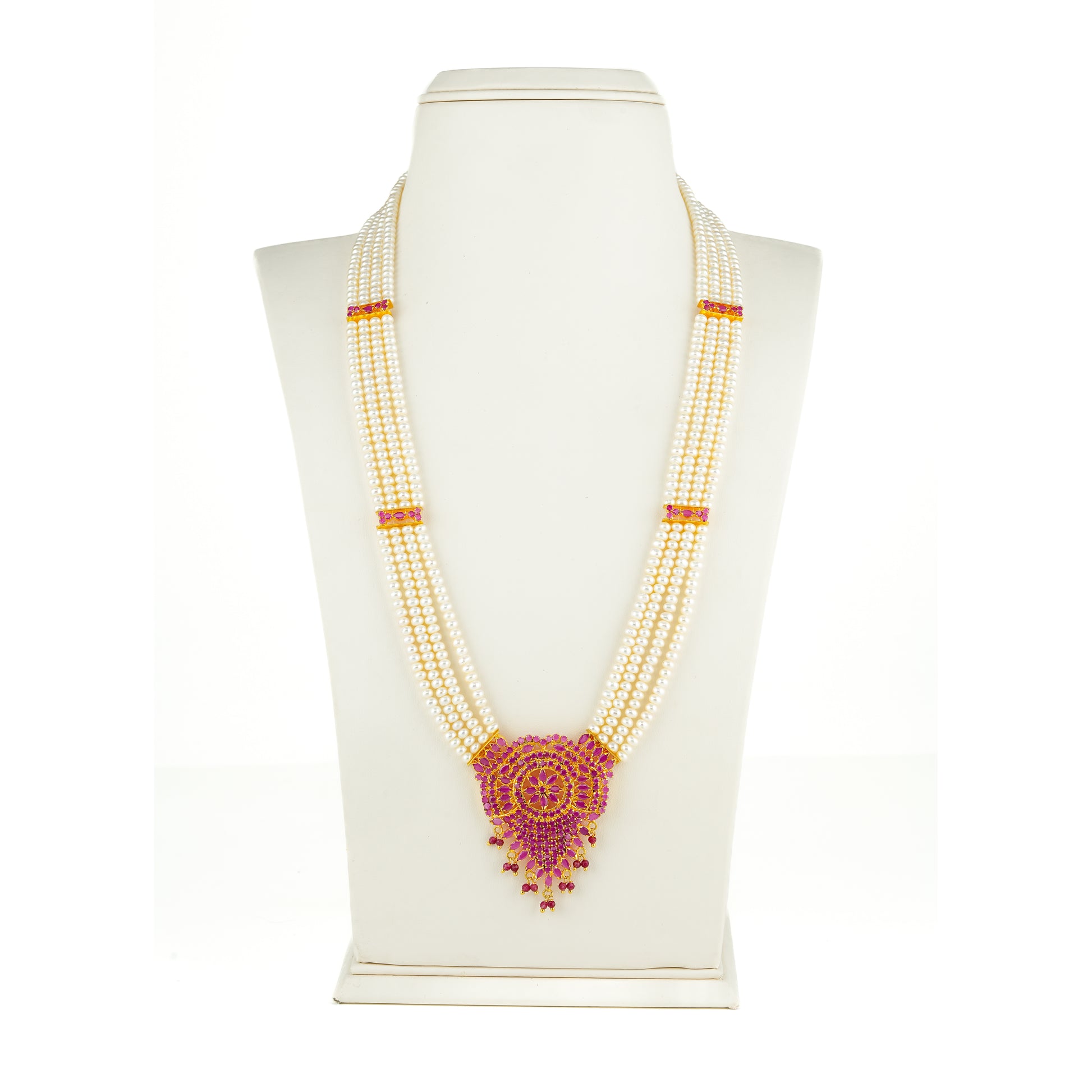 This regal necklace set is crafted with Freshwater Cultured Pearls in a 4-row design, measuring 20 inches in length. The pearls, sized 3-4mm and graded AA quality, are paired with striking red stones for a timeless traditional look. The piece reflects elegance and heritage, making it perfect for weddings, festive occasions, and cultural celebrations. With a life-long guarantee on pearls, this Rani Haar adds a royal charm to sarees, lehengas, and other ethnic attire.