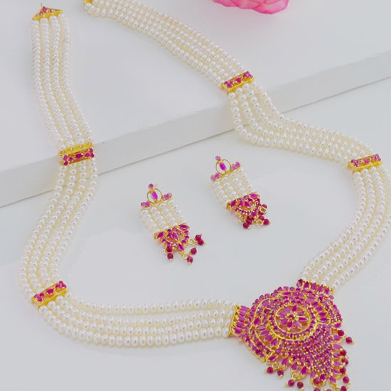 Traditional Rani Haar Red Stone With Freshwater Pearl Necklace Set
