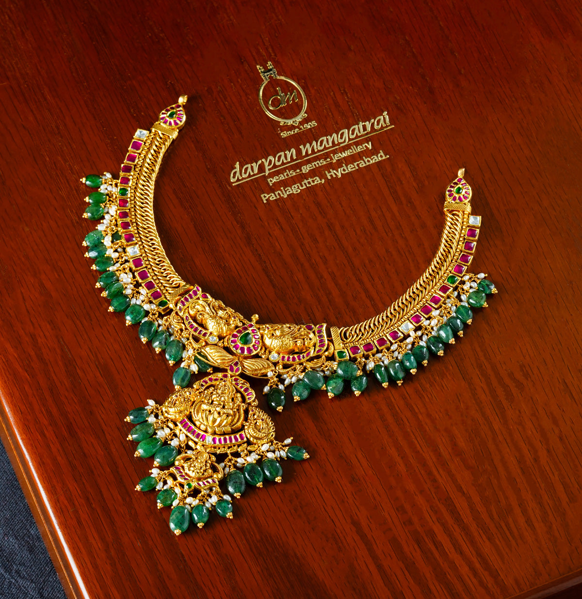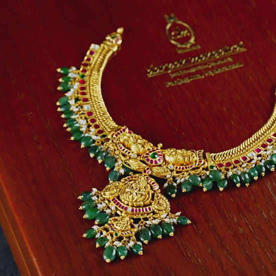 Enquire Now On WhatsAppThe Trendy Emerald Gold Necklace is a captivating fusion of elegance and modern style, crafted in radiant gold and adorned with vibrant emeralds that exude natural charm. Its intricate design and polished finish reflect timeless artistry, making it a statement piece for every jewelry collection. The rich green hues of emeralds add sophistication and grace, while the golden base enhances its luxurious appeal. Perfectly balancing tradition with contemporary elegance, this necklace is designed to stand out on every occasion. Ideal for weddings, festive celebrations, and evening gatherings, it pairs beautifully with sarees, lehengas, and gowns, elevating your look with regal charm.