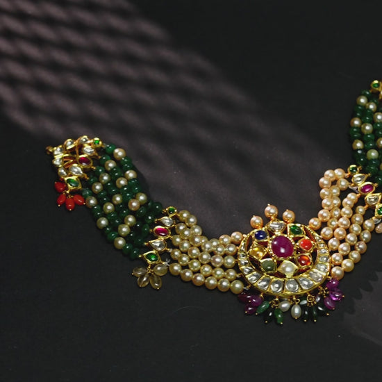 Enquire Now On WhatsAppThe Versatile Kundan Pearl and Emerald Uncut Diamond Navaratna Stone Choker is a regal masterpiece, crafted with intricate kundan artistry and adorned with radiant pearls, vibrant emeralds, and uncut diamonds. Enhanced with the brilliance of Navaratna stones, it symbolizes prosperity, balance, and timeless charm. The detailed craftsmanship and harmonious blend of colors create a luxurious appeal, making it a treasured statement piece in any collection. Rich in heritage yet versatile in design, it reflects both tradition and sophistication. Ideal for weddings, festive occasions, and grand celebrations, it pairs beautifully with sarees, lehengas, and designer ensembles, adding unmatched grace and opulence