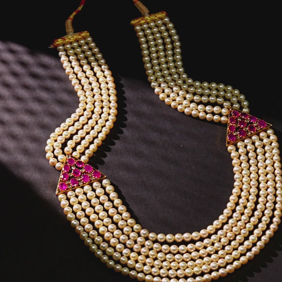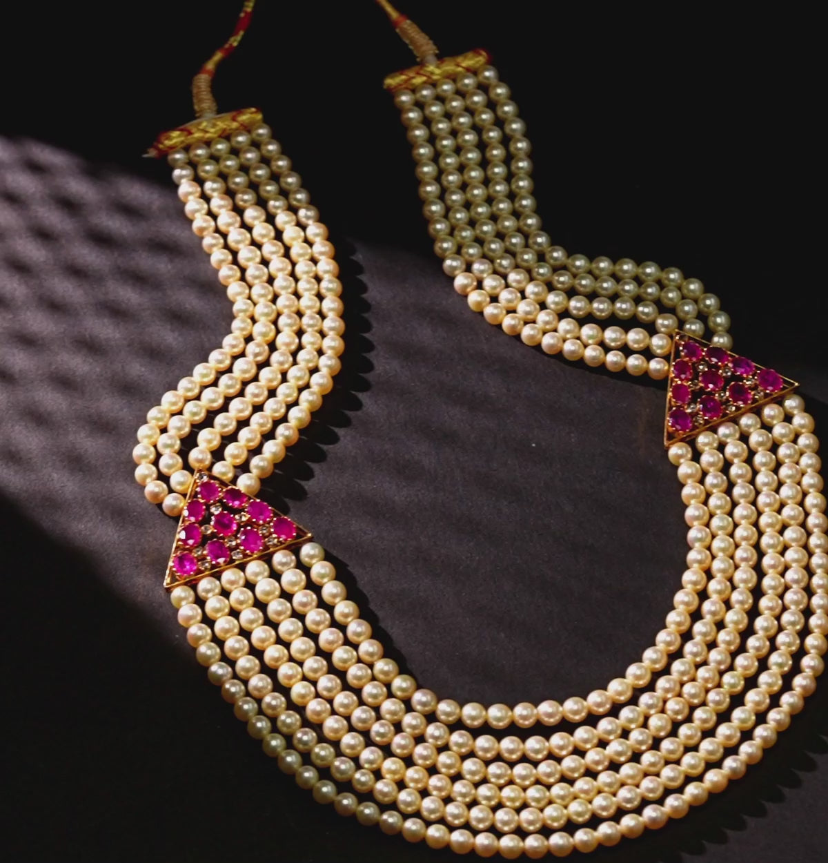 Enquire Now On WhatsAppIntroducing the Versatile Ruby Pearl Side Piece Necklace, a stunning blend of elegance and timeless charm. Featuring lustrous pearls and vibrant rubies accentuating intricately crafted side pieces, this necklace reflects exceptional craftsmanship and harmonious design. Each element is meticulously arranged to create a balanced, eye-catching look that enhances any jewelry collection. Lightweight and comfortable, it rests gracefully along the neckline, offering both style and ease of wear. Ideal for weddings, festive celebrations, or special occasions, this necklace pairs beautifully with traditional sarees, lehengas, and contemporary ensembles alike, adding a touch of refined elegance and vibrant sophistication to elevate your attire.