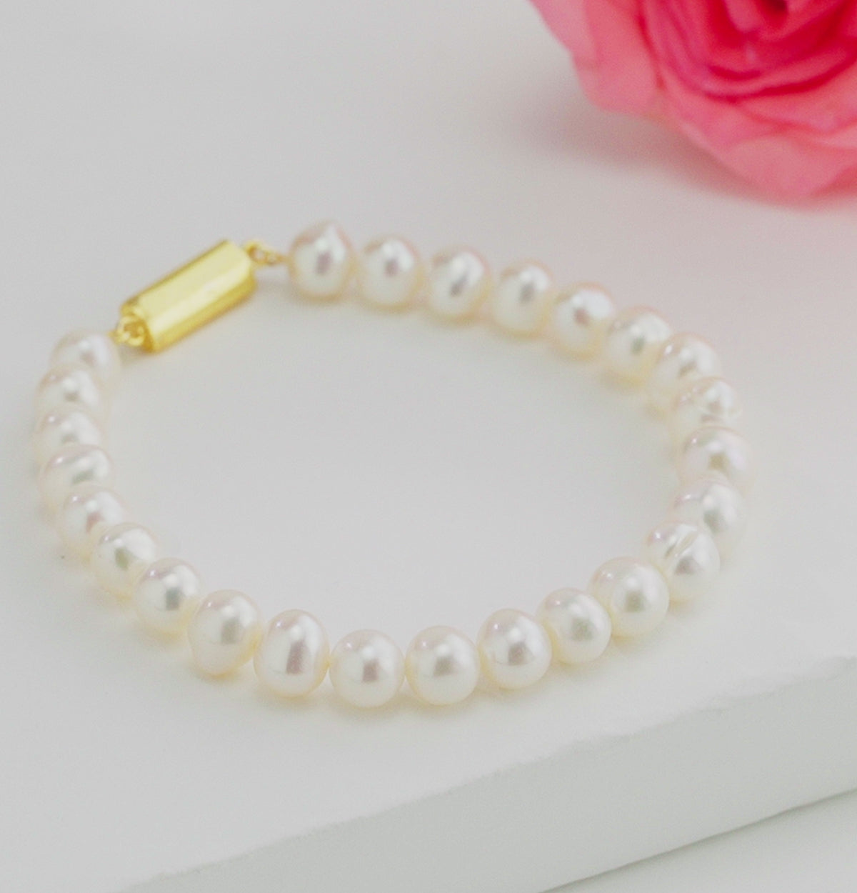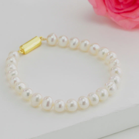 Elegant and timeless, the White Near Round Pearl Bracelet is crafted from premium Freshwater Cultured Pearls. Featuring 6-7MM near-round pearls in a pristine white hue, each piece is graded AA for superior luster and surface quality. The bracelet is backed by a Life Long Guarantee on Pearls, ensuring lasting beauty and value. Its minimal yet sophisticated design makes it a versatile accessory for daily elegance or special moments. Perfect for weddings, festive celebrations, or pairing with both traditional and modern attire, adding a touch of grace to any outfit.