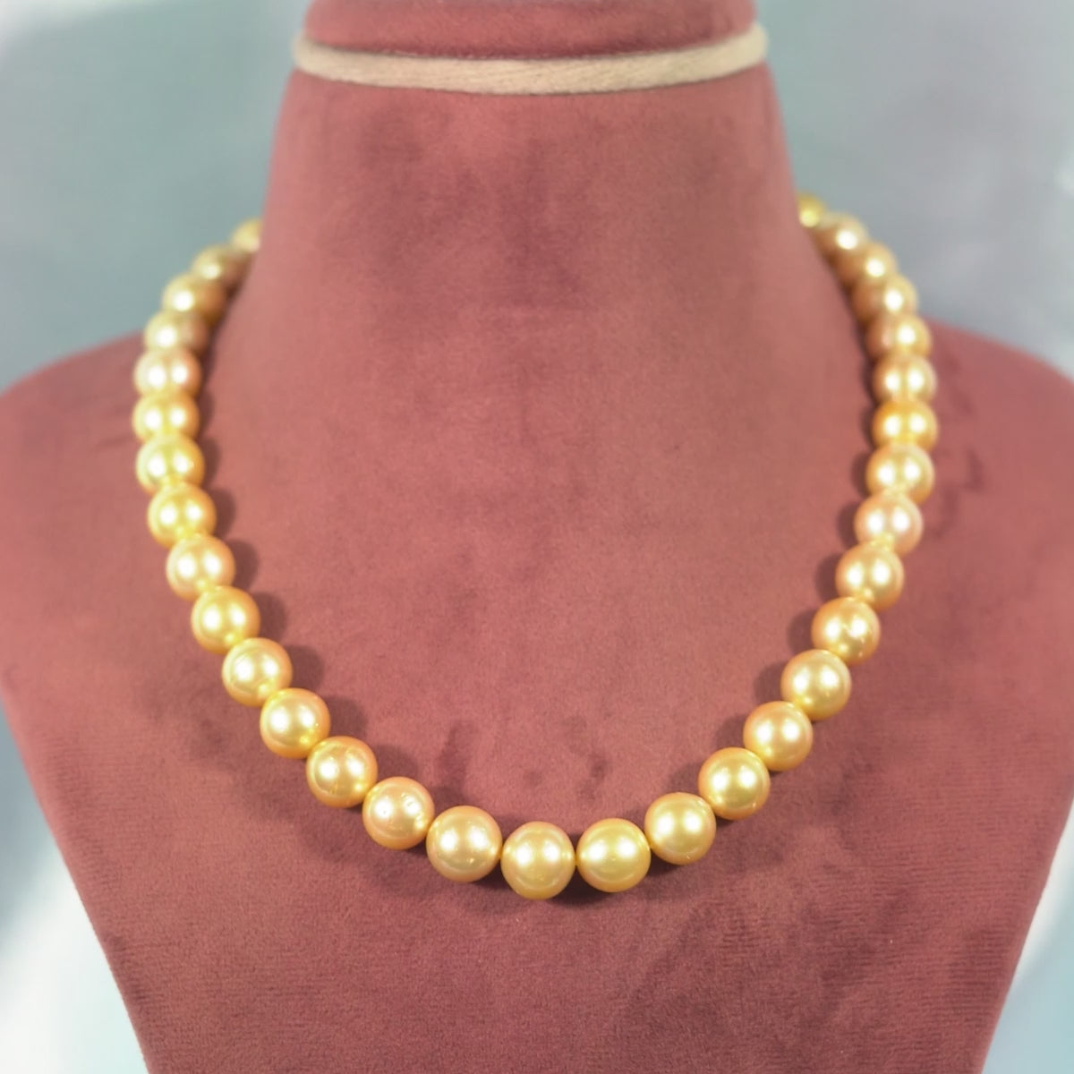 Elevate your elegance with this luxurious South Sea pearl necklace, featuring radiant golden saltwater cultured pearls in a classic round shape. Each AAA-quality pearl measures 12–13 mm and is strung in a single, graceful 18-inch row, weighing approximately 548.85 grams. Backed by a lifelong guarantee and a Certificate of Authenticity, this exquisite piece ensures timeless beauty and authenticity. Perfect for weddings, formal events, or festive occasions, it complements both traditional and contemporary attire with sophistication.