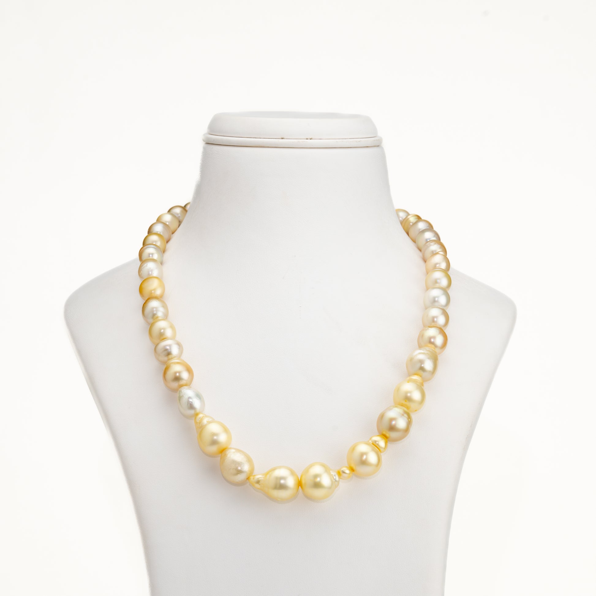 This striking necklace set showcases rare 14–15mm cream Baroque South Sea pearls, prized for their organic shapes and rich, natural luster. Designed in a refined single-row, 18-inch style, it highlights the bold elegance and individuality of each pearl. With an approximate pearl weight of 401 carats, this A-quality set offers exceptional presence and timeless appeal. It includes a Life Long Guarantee on Pearls and a Certificate of Authenticity, ensuring 100% genuine pearls.