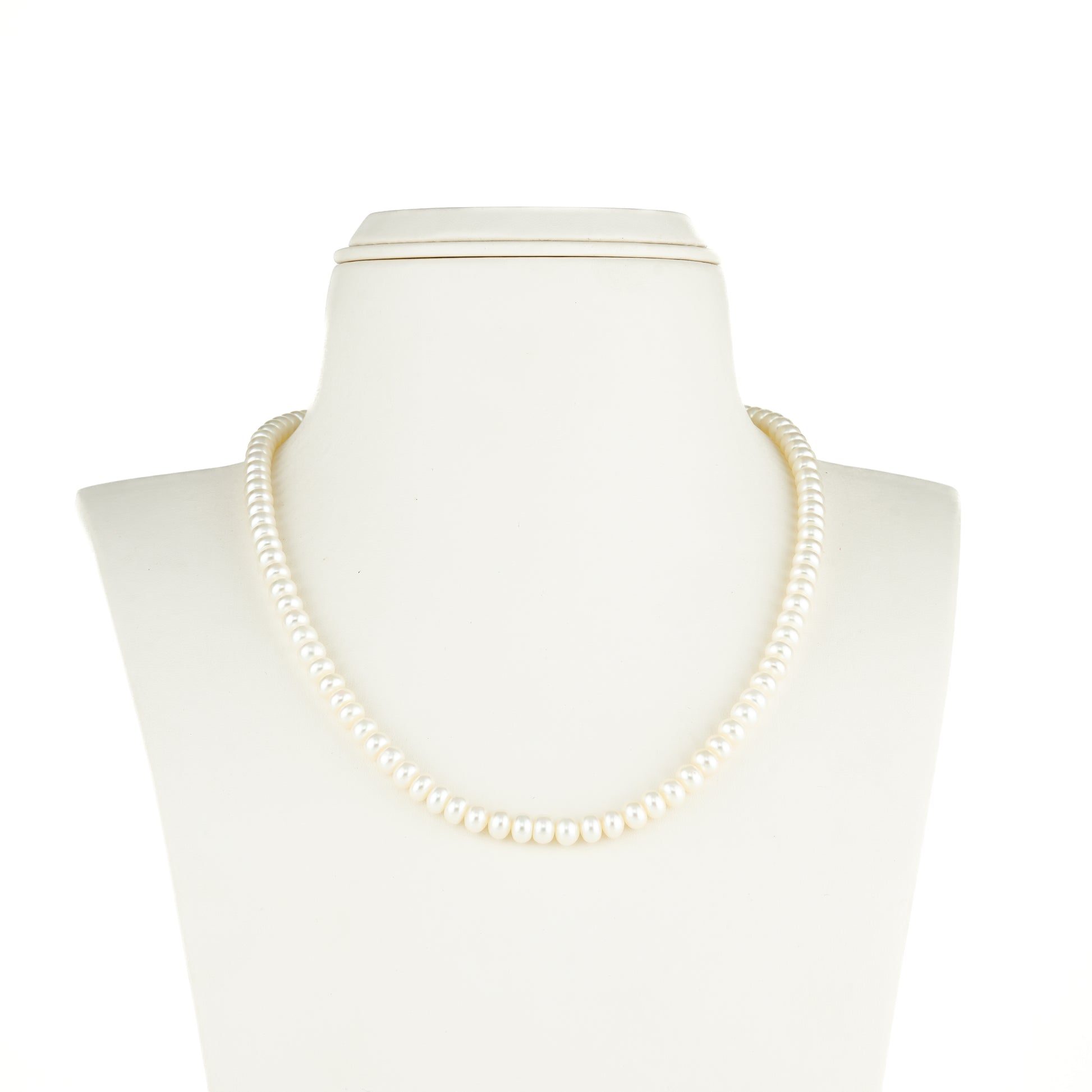 Elegant and versatile, this single-row freshwater cultured pearl necklace is crafted with luminous AA quality button-shaped pearls sized 5.0-6.0mm. The pristine white pearls reflect timeless charm, while the 18-inch length ensures a comfortable and graceful drape on the neckline. With an approximate weight of 34 grams, this lightweight piece combines durability with refined elegance, making it a valuable addition to any jewelry collection. Backed by a life-long guarantee on pearls, it promises enduring beauty. Ideal for weddings, festive celebrations, and formal gatherings, it also pairs effortlessly with everyday and professional attire, adding classic sophistication to any look.