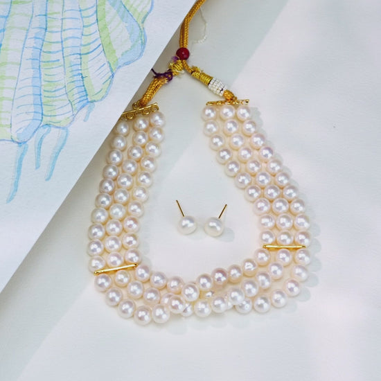 Showcase refined charm with this 3-row freshwater cultured pearl necklace, crafted with radiant round white pearls sized 7–8 mm. Measuring 10 inches in length and weighing approximately 62.9 grams, this AA-grade piece is compact yet impactful, offering a bold, layered look. The classic elegance of its pearls is matched by a lifelong guarantee, making it a valuable and lasting accessory. Ideal for high-neck blouses, festive wear, or semi-formal occasions, it adds a regal accent to sarees, lehengas, or Indo-western outfits—effortlessly blending tradition with contemporary flair.