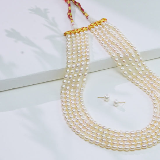 Drape yourself in luxury with this grand 18-inch necklace featuring five rows of exquisite white freshwater cultured pearls. Expertly crafted with drop-shaped pearls measuring 7–8 mm and weighing approximately 167.600 grams, this necklace exudes opulence and timeless grace. Each pearl is graded 'A' for its radiant shine and consistency, and comes with a lifelong guarantee, ensuring quality that endures. The multi-layered design creates a stunning visual impact, ideal for making a regal statement. Perfect for weddings, festive celebrations, or gala evenings—pairs beautifully with bridal wear, silk sarees, and high-fashion attire for a look of unmatched elegance.