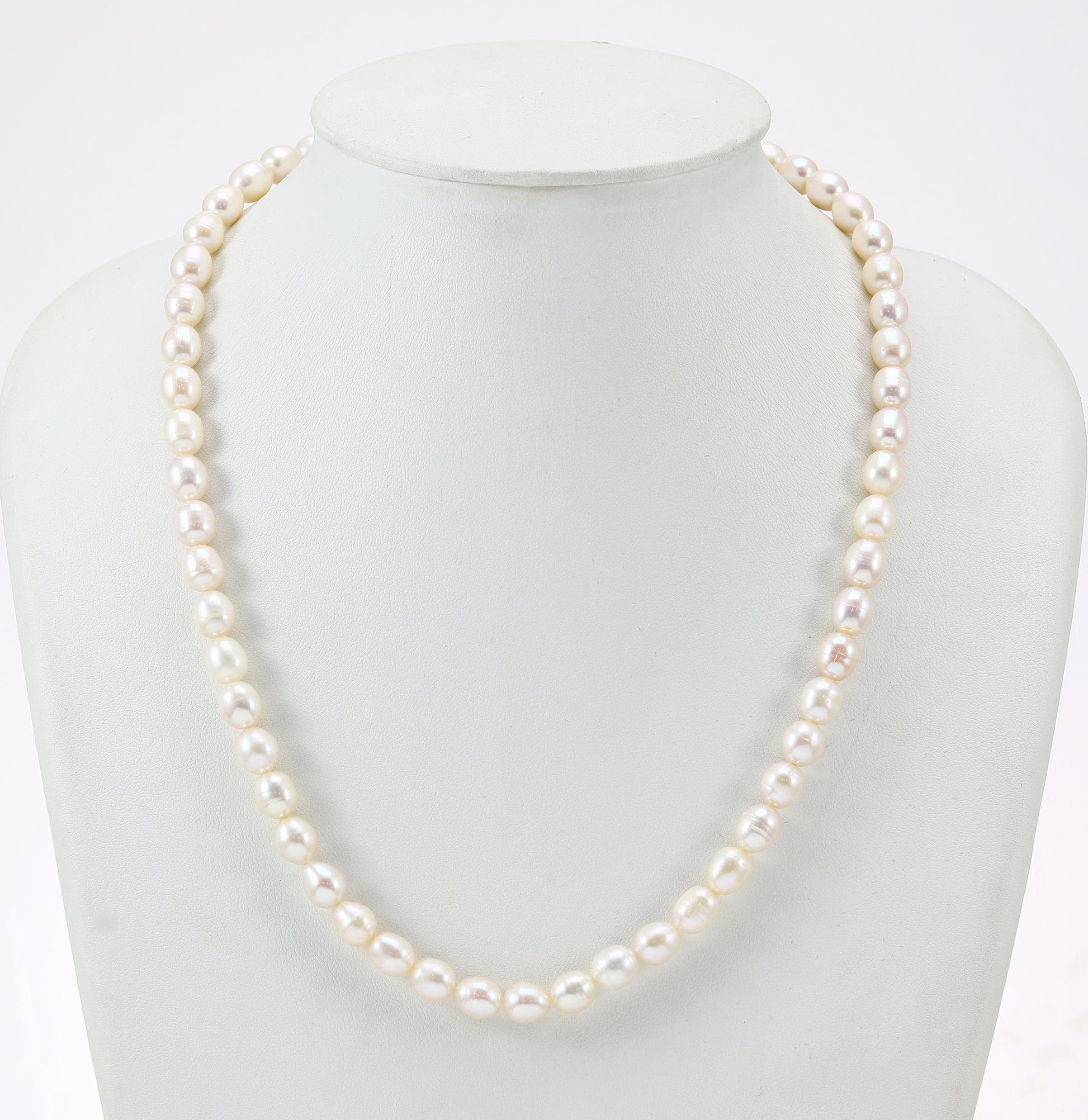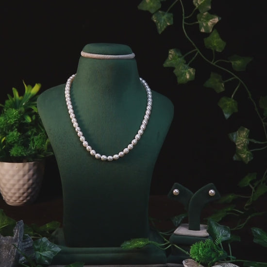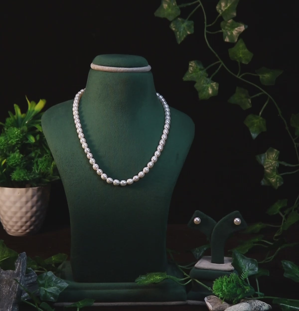 Refined and timeless, this elegant necklace features a single row of freshwater cultured pearls in a classic white hue and graceful drop shape. Each 7-8 mm A-grade pearl is strung on an 18-inch strand, with a total weight of approximately 25.700grams. Crafted for everyday luxury and long-lasting beauty, it comes with a lifelong guarantee on pearls. The simplicity of design paired with the purity of white pearls makes this piece an essential staple. Ideal for daily wear, office attire, or light festive occasions, it complements sarees, kurtis, and elegant western outfits effortlessly.