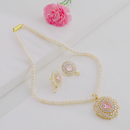 Delicate and graceful, the Floral Pink Stone Freshwater Pearl Necklace Set exudes feminine charm and timeless elegance. Crafted with lustrous white freshwater cultured pearls in a smooth button shape (4–5 MM), it radiates soft sophistication. The design is highlighted by a single floral pink stone pendant, adding a gentle pop of color and a touch of romantic allure. Measuring 16 inches in length, this single-row necklace complements both traditional and contemporary styles. With A-grade pearls and a Life Long Guarantee on Pearls, it’s the perfect piece for special occasions or elegant everyday wear.