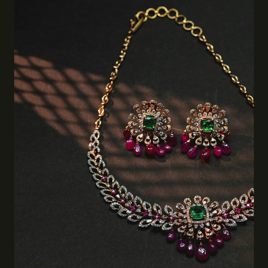 Enquire Now On WhatsAppThe Artisanal Diamond Necklace Set is a timeless creation that reflects masterful craftsmanship and refined luxury. Adorned with meticulously cut diamonds, this set includes a beautifully designed necklace paired with elegant earrings, exuding sophistication and charm. Each diamond is set with precision to highlight its brilliance, making this set a statement of artistry and grace. A perfect blend of tradition and modernity, it’s an essential addition to every fine jewelry collection. Ideal for weddings, festive occasions, and grand celebrations, this necklace set pairs effortlessly with both traditional ensembles and contemporary attire, elevating your style with unmatched elegance.