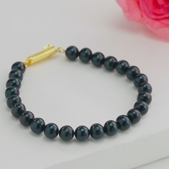 The Black Single Row Near Round Freshwater Pearl Bracelet exudes sleek sophistication with its 6-7MM near-round pearls in a rich, lustrous black hue. Crafted from AA-grade freshwater cultured pearls, each pearl is hand-selected for its smooth surface and radiant shine. Measuring 7 inches, this bracelet offers a comfortable fit for daily wear or special occasions, while the Life Long Guarantee on Pearls ensures enduring elegance. Perfect for evening parties, festive gatherings, or adding a refined edge to casual outfits, it’s a versatile accessory that complements both contemporary and traditional styles.