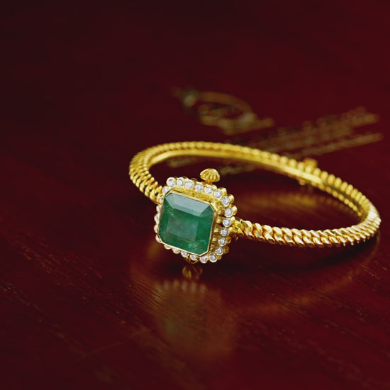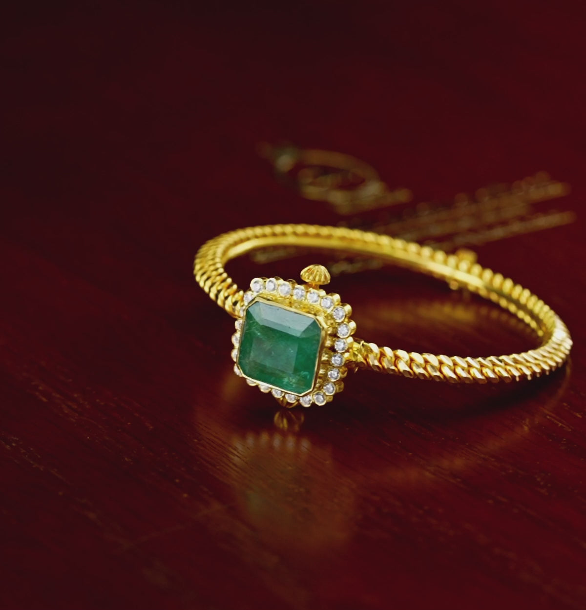 Enquire Now On WhatsAppThe Classic Emerald Bangle is a timeless expression of elegance and tradition, crafted in radiant gold and adorned with lustrous emeralds that exude sophistication. Its sleek yet intricate design highlights fine craftsmanship, making it a versatile addition to any jewelry collection. The rich green hues of emeralds beautifully contrast with the golden sheen, creating a luxurious appeal. Lightweight and comfortable, it offers both style and grace for every occasion. Ideal for weddings, festive celebrations, and everyday elegance, this bangle pairs seamlessly with sarees, lehengas, and contemporary outfits, adding a touch of regal charm and refined beauty to your attire.